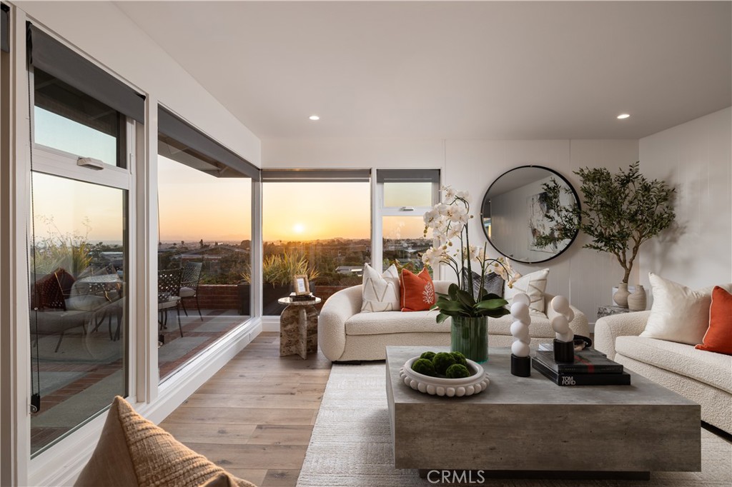 From the sparkling Pacific Ocean and romantic sunsets to dazzling city lights and Catalina Island, panoramic views enhance nearly every room of this impeccably maintained and carefully updated home in Corona del Mar’s sought-after Harbor View Hills. Walls of floor-to-ceiling windows wrap the single-level residence in glass, bringing abundant natural light indoors and welcoming vistas overlooking Fashion Island’s office towers, adjoining neighborhoods and Newport Harbor. The three-bedroom, two-bath design is approximately 2,474 square feet of free-flowing space. Offering magnificent ocean and city views, the living room opens to an intimate rear patio and features a classic brick fireplace, while the dining room offers access to the front yard and an ocean-view kitchen. White cabinetry and white countertops are complemented by a built-in pantry and upgraded stainless steel appliances, creating a functional and aesthetically pleasing space for mealtime preparation and entertaining. Both secondary bedrooms showcase ocean and evening-light views, and a generously sized family room displays a high ceiling with skylight, built-in cabinets and desks, and an adjacent laundry room with sink and ample storage cabinetry and shelving. Mid-Century style characterizes the large primary suite, which opens to the front patio and presents an interior French door to the family room, extensive mirrored closets, a period-perfect sunken tub, elegant floating vanity, and a shower with custom frameless-glass enclosure. Renovated in 2024, updates include a kitchen pass-through, Dutch door, refreshed landscaping, and upgraded showers with newer frameless doors. Additional improvements include new interior paint, new lighting, and a new epoxy floor in the two-car garage. Grounds measure nearly 7,128 square feet, allowing room for a circular driveway and an exceptionally private walled front yard with raised patio and low-maintenance turf. Harbor View Hills is directly across the street from Corona del Mar Plaza, beaches, and award-winning schools are minutes away.