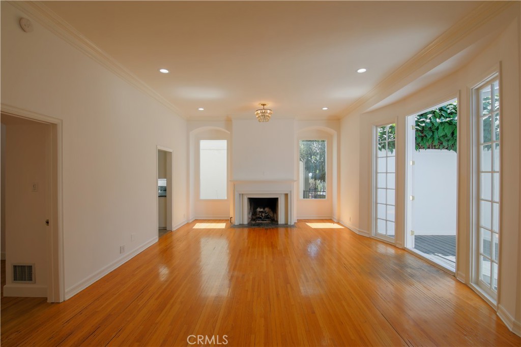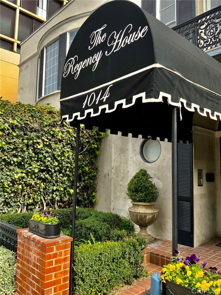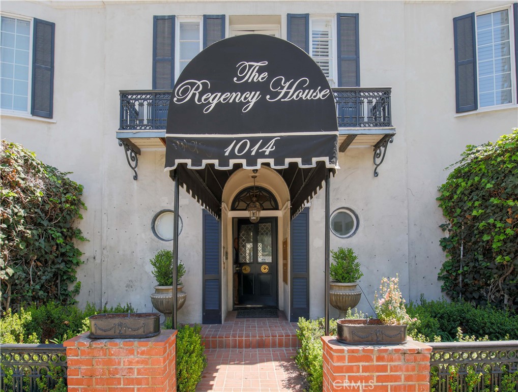 Regency House built in 1938, European elegance accented by preserved original details throughout – all complimented by access to a picturesque, internal courtyard with a seating area and fountain. This Hollywood Regency-style ground floor, corner unit benefits from no shared walls and 2 separate entrances:a private, rear kitchen entry; and a main-entry door directly off the lobby. It has a private, in-unit laundry with full sized washer and dryer included; a gas burning fireplace in the living room; 12 foot high ceilings; 2 large balconies, one full bath and a second one-half bath located directly off the living room, with a wall hung toilet. The large master bedroom has an attached private patio and a massive amount of closet space (needs to be seen to be believed), along with a full bathroom with double sinks, garden window and marble floors. Replaced matching hardwood floors in the bedroom make for a seamless transition from the living room’s original, beautiful red-oak flooring. An oversized chef’s kitchen includes an extra-large stainless steel range with two ovens; granite countertops; stainless steel fridge/freezer;dishwasher; and a French-paned door to the courtyard. Indoor outdoor living is exemplified by French doors leading from the living room to a private balcony. Remote control for 2 living room window blinds. It has its own private, fully enclosed garage with remote opener. An amazing property that shows pride of ownership and attention to detail-a complete gem and piece of Hollywood history rarely on the market.