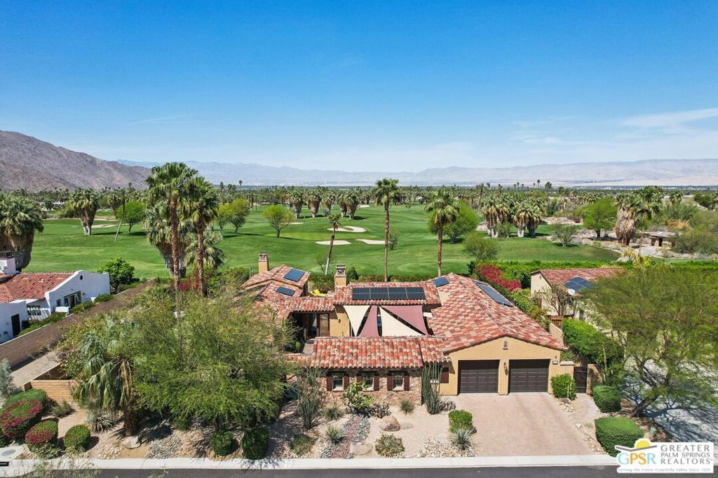 Located in the beautiful Monte Sereno, one of South Palm Springs’ most exclusive gated communities. This 3 bed, 3.5 bath home with a den offers the perfect blend of luxury and comfort. Step inside to an open floor plan with soaring ceilings and multiple doors that open to the outside, showcasing gorgeous mountain views. Also includes Guest house with private entrance, office, bedroom area and private bath. The gourmet kitchen features two detached islands, stainless steel appliances, a wine fridge, and a walk-in pantry, all opening to a light and bright dining and living area designed for effortless entertaining. The spacious and private backyard is a true retreat with a covered patio, cozy fireplace, putting green, and stunning mountain views. Situated on fee land with owned solar, this is desert living at its finest.
