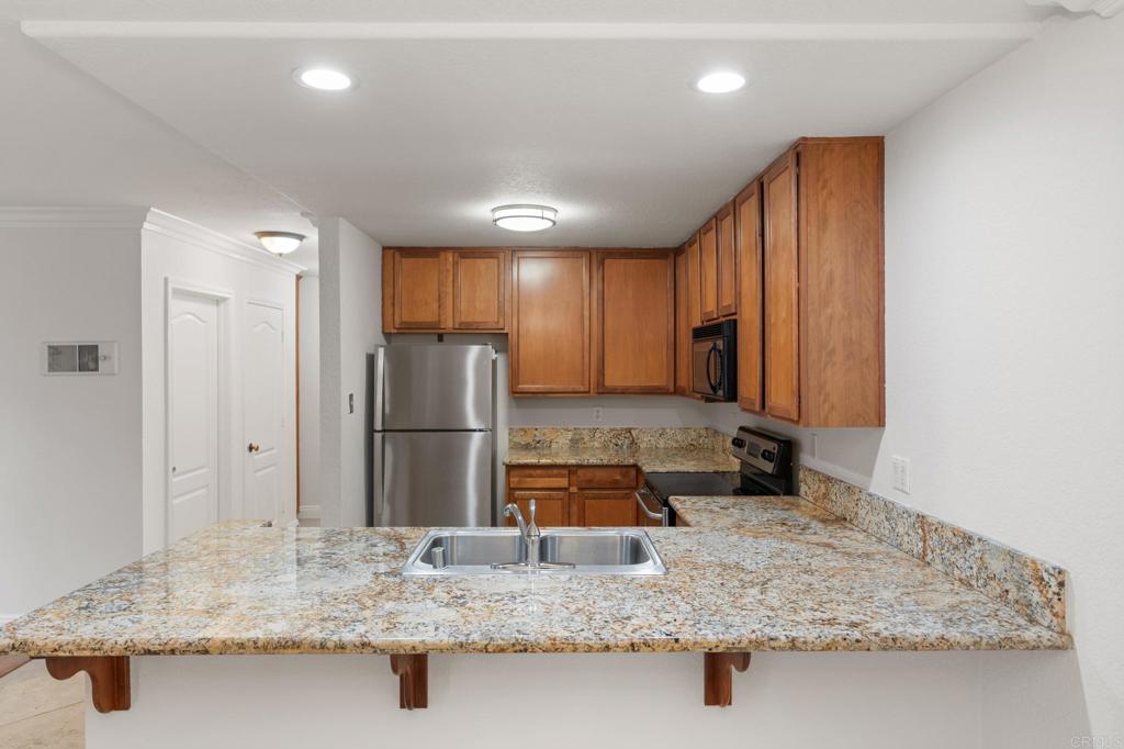 Welcome to this beautifully maintained and move-in-ready ground-level condominium located in the heart of Escondido. This spacious 2-bedroom, 2-bathroom home offers 913 square feet of thoughtfully designed living space with a highly desirable single-story layout—ideal for comfortable everyday living. The open-concept kitchen features granite countertops, ample cabinetry, stainless steel appliances, and a large breakfast bar that flows seamlessly into the living and dining areas. Perfect for entertaining, working from home, or enjoying quiet evenings in, the layout maximizes both function and space. The bright living room is filled with natural light and opens directly to a private patio—ideal for morning coffee, evening relaxation, or creating your own outdoor retreat. Neutral flooring and clean finishes throughout give the home a modern, turnkey feel. The primary bedroom offers generous closet space and a private ensuite bathroom, providing comfort and privacy. The secondary bedroom is well-sized and versatile—perfect for guests, a home office, or additional family members. A second full bathroom adds convenience for daily living. Additional highlights include in-unit laundry, central heating and air conditioning, and two assigned parking spaces. The community is well-maintained and offers a peaceful residential setting while remaining close to everything Escondido has to offer. Conveniently located near shopping, dining, parks, schools, and Downtown Escondido, with easy access to Centre City Parkway and major commuter routes. Whether you’re a first-time buyer, downsizing, or looking for a solid investment opportunity, this property checks all the boxes. Homes in this community rarely become available. Don’t miss your opportunity to own a move-in-ready condominium in a prime North County location.