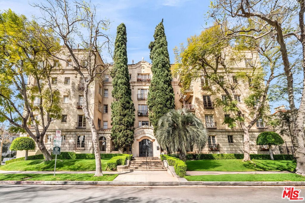 This exceptional 3rd-floor corner unit blends the charm of 1928 architecture with refined modern updates. Soaring ceilings, exposed concrete beams, and oversized French windows flood the space with natural light from its prime northeast-facing orientation. Rich hardwood floors flow through an open living and dining area, leading to a beautifully designed Euro-style kitchen featuring custom cabinetry, premium countertops, a center island, and top-tier Miele and Bosch appliances, including a built-in fridge and dishwasher perfect for cooking and entertaining. The tranquil primary bedroom opens through double doors to leafy Sycamore treetop views, while the spa-inspired bathroom is finished with designer fixtures and luxurious tile. Juliet balconies, concrete columns, and a breezy layout bring a sophisticated, loft-like feel throughout. Located in the iconic Warwick building, residents enjoy a fully equipped gym, a serene European-style courtyard with a fountain, and secure subterranean parking. Ideally positioned on Sycamore Avenue, you’re just minutes from The Grove, Republique, Sugarfish, and LA’s top studios. A rare opportunity to own a piece of Los Angeles history. Schedule your showing today.