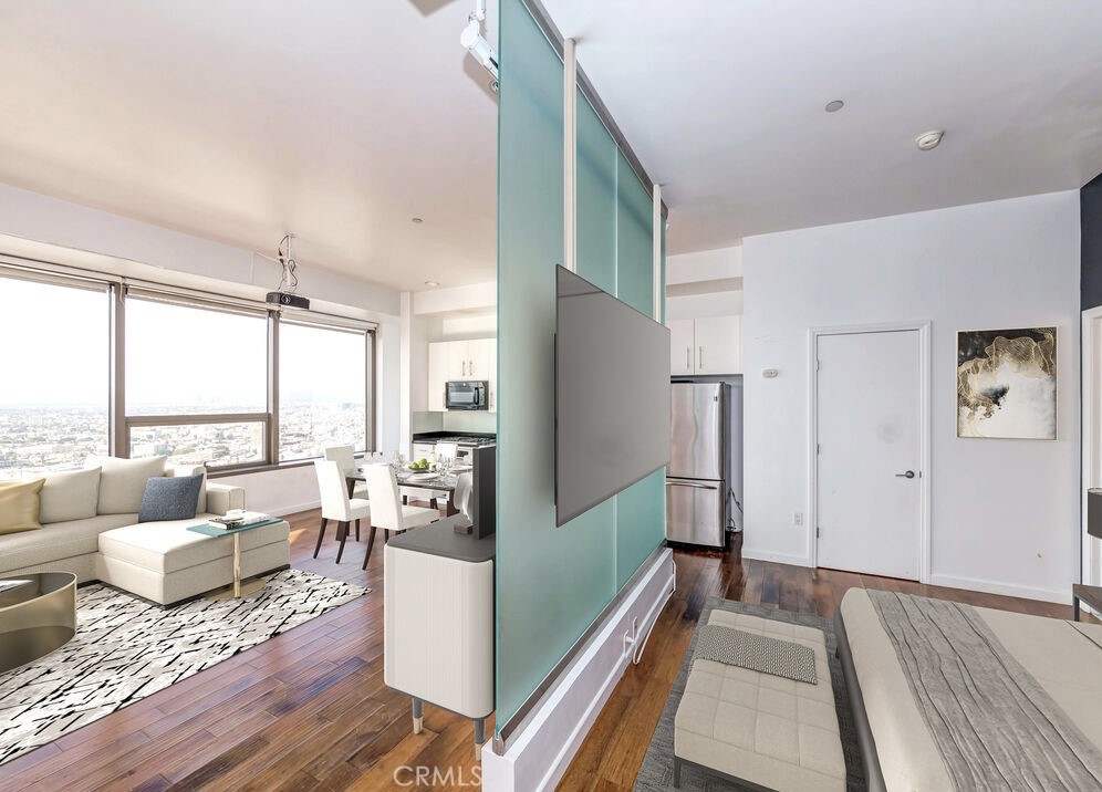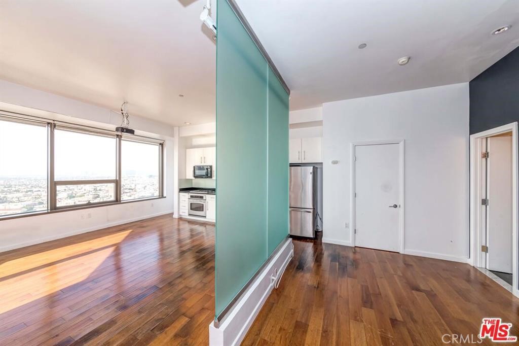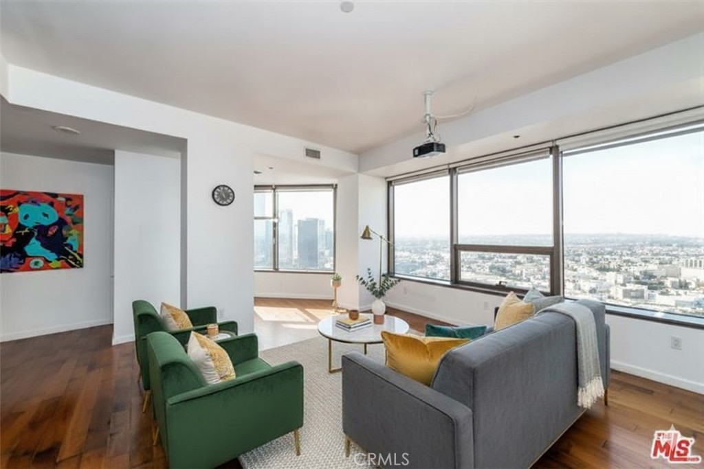 A rare corner loft suite on the 22nd floor offering sweeping southwest facing panoramic views of the Downtown LA skyline, LA Live, the Westside, and the resort style sky deck with pool. The flexible den functions perfectly as a breakfast nook or home office. The modern European style kitchen features upgraded appliances, granite countertops, and elegant cabinetry, complemented by wood floors throughout. A glass partition subtly separates the living and sleeping areas while maintaining an open airy loft feel. Additional highlights include an in unit LG washer and dryer, a spacious bathroom with storage, and two side by side parking spaces. Residents enjoy resort quality amenities, including a 17th floor sky deck with a heated infinity pool, spa, cabanas, lounge beds, wet bar, BBQ grills, and a fire pit lounge area. The building also offers a fully equipped fitness center, media and screening room, business center, and 24 hour concierge, security, and on site management. Located just moments from LA Live, Crypto.com Arena, the Convention Center, public transit, restaurants, and major freeways, this corner unit combines exceptional design, bright and open living, and the very best of downtown lifestyle.