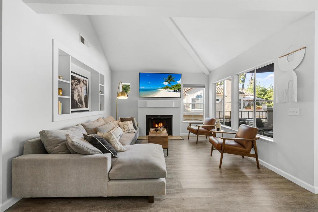 This remarkable residence boasts a spacious living area of 1,116 square feet. With two bedrooms and two full bathrooms, this home radiates comfort and style. The property’s interior showcases plenty of natural light, and high ceilings that create a sense of openness. The open floor plan further enhances its spaciousness, providing seamless transitions between rooms – perfect for hosting guests or simply enjoying day-to-day living. This end-unit shares only one wall with neighboring units. The kitchen features quartz countertops complemented by stainless steel appliances. For added convenience, you’ll find full sized side-by-side washer and dryer. The master bedroom features a walk-in closet, dual vanity, spacious walk-in shower with glass doors, and private lavatory. Additionally, the private balcony comes furnished with sunny views of the hills and surrounding greenery. A classic gas fireplace provides a cozy ambiance during cooler evenings, and air conditioning ensures comfortable temperatures through warmer months. The home’s exterior is equally impressive with access to guest parking, community pool and spa, as well as a sandy volleyball court – perfect for basking in sunshine or unwinding after a long day. A private garage offers secure parking and additional storage options, with 1 more assigned parking space, as well as guest pass for parking. Conventional financing available!