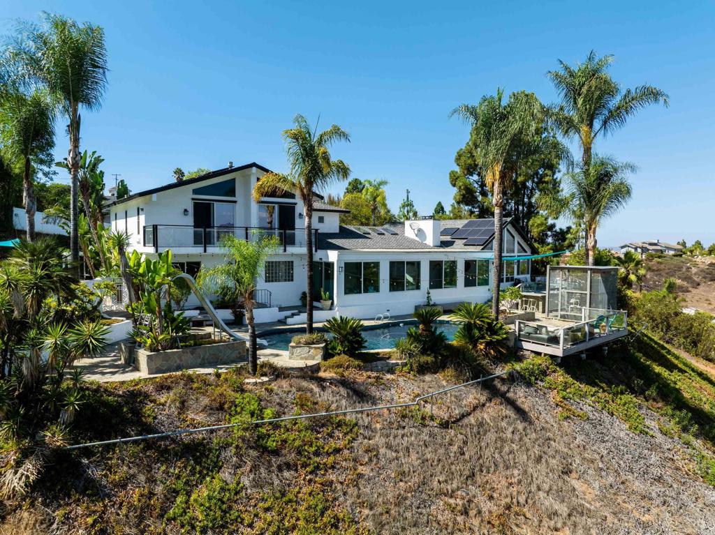 Absolute STUNNER in Mount Helix / Horizon Hills! This private contemporary California-style home is gorgeous inside and out, showcasing 180-degree panoramic views. Modern finishes throughout, including stainless steel appliances, stone counters, travertine & luxury vinyl flooring, custom light fixtures, vaulted ceilings, multiple skylights, and two gas fireplaces. The entire second floor primary suite is the perfect retreat, with floor to ceiling windows and private balcony overlooking pool and amazing mountain views. Massive spa-like ensuite bathroom with a huge custom walk-in closet, a secondary closet, tons of storage and its own HVAC. An attached large studio/granny flat/ADU (currently renting for $1500/mo.) includes a private exterior entry, kitchen, bathroom and walk-in closet. This beautiful, gated estate, just shy of an acre, is a fully fenced corner lot with spacious artificial grass area, koi pond, multiple decks, outdoor kitchen, fruit trees, RV parking, and a large in ground heated pool with waterfalls. In addition, there is an oversized attached 4-car garage, 40 solar panels and dual zoned main floor HVAC.
