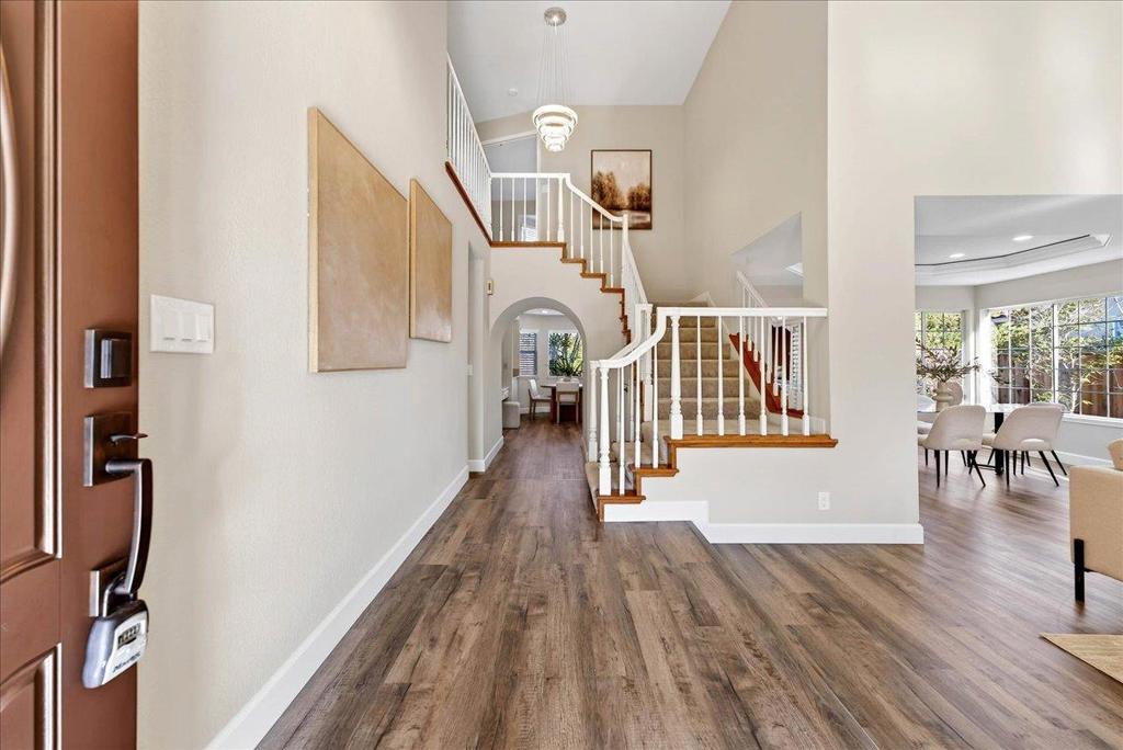 Located in the heart of Almaden Valley within the Glencrest Estates neighborhood, this beautifully refreshed home is set on a quiet residential street known for its scenic surroundings and close proximity to highly regarded schools, parks, and walking trails. A dramatic entry and living room with vaulted ceilings create a grand first impression. Recent enhancements include new luxury vinyl plank flooring on the main level, new carpet upstairs, fresh interior paint, recessed lighting, and new heating and air conditioning systems. The spacious kitchen features stainless steel appliances, generous counter space, and a sun-filled breakfast nook. The open main living area combines the living room and formal dining area, while the separate family room features a fireplace with custom wood cabinetry. The floor plan offers excellent flexibility with one bedroom and a full bath on the main level, additional bedrooms upstairs, and a three-car garage. Upstairs, the bonus room offers a lot of versatility and can easily be used in a number of different ways. The backyard includes multiple mature fruit trees and space to relax or entertain. Residents also enjoy access to community amenities including a pool and neighborhood exercise trails. This home is a must see.