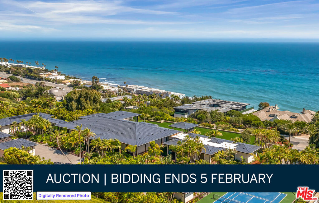 AUCTION BIDDING OPEN: Bidding ends February 5th. Previously Listed $29.95M. Current High Bid $15M. Showings Saturday & Sunday 1-4pm, and Daily By Appt. A palatial single-story estate at MariSol Malibu, redefines sustainable luxury living. Built in 2023 by renowned architect Doug Burdge and inspired by the Four Seasons Hualalai, this certified net zero carbon residence captures the essence of Hawaiian resort living across two acres with breathtaking whitewater ocean views stretching to Catalina Island. The compound features tennis and basketball courts with pickleball, infinity pool pavilion, and a recently expanded backyard rivaling a sports pitch. Lush tropical landscaping and an interior glass bridge connecting main and guest houses create an island sanctuary. The nearly 2,000-square-foot primary suite opens to ocean waves while two kitchens with three center islands showcase Miele and Gaggenau appliances. Wellness amenities include gym, redwood sauna, and steam room. Built with sustainably sourced lava rock and low carbon concrete Southern California’s first to meet Marin County standards this 100% electric home operates with Tesla Powerwalls and solar panels, representing the pinnacle of sustainable coastal living.
