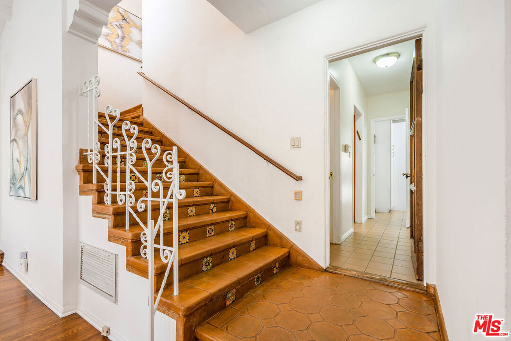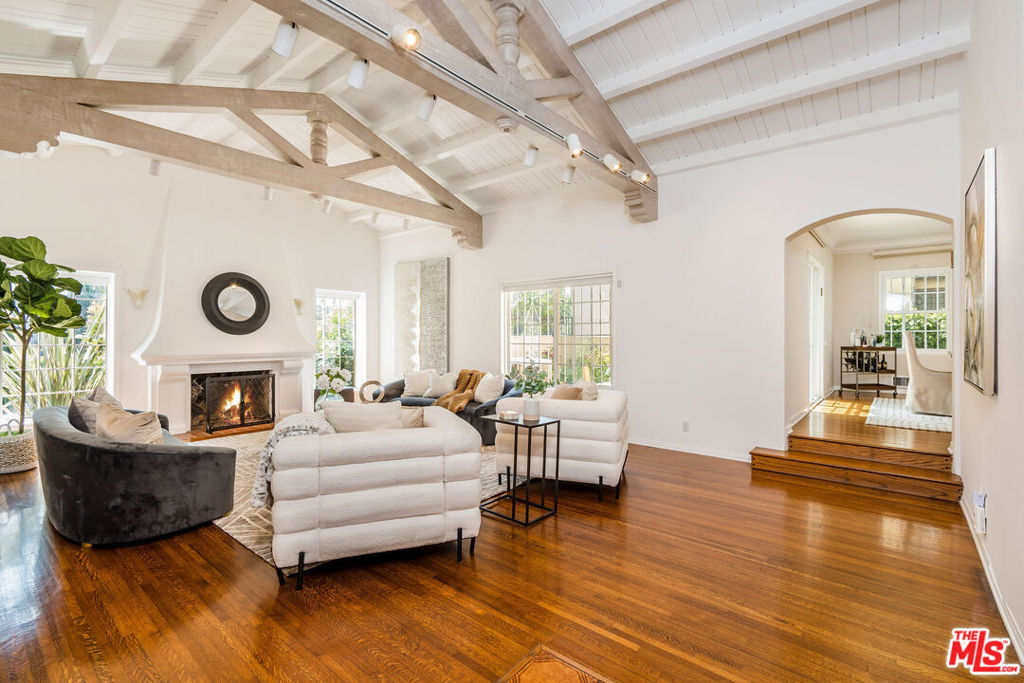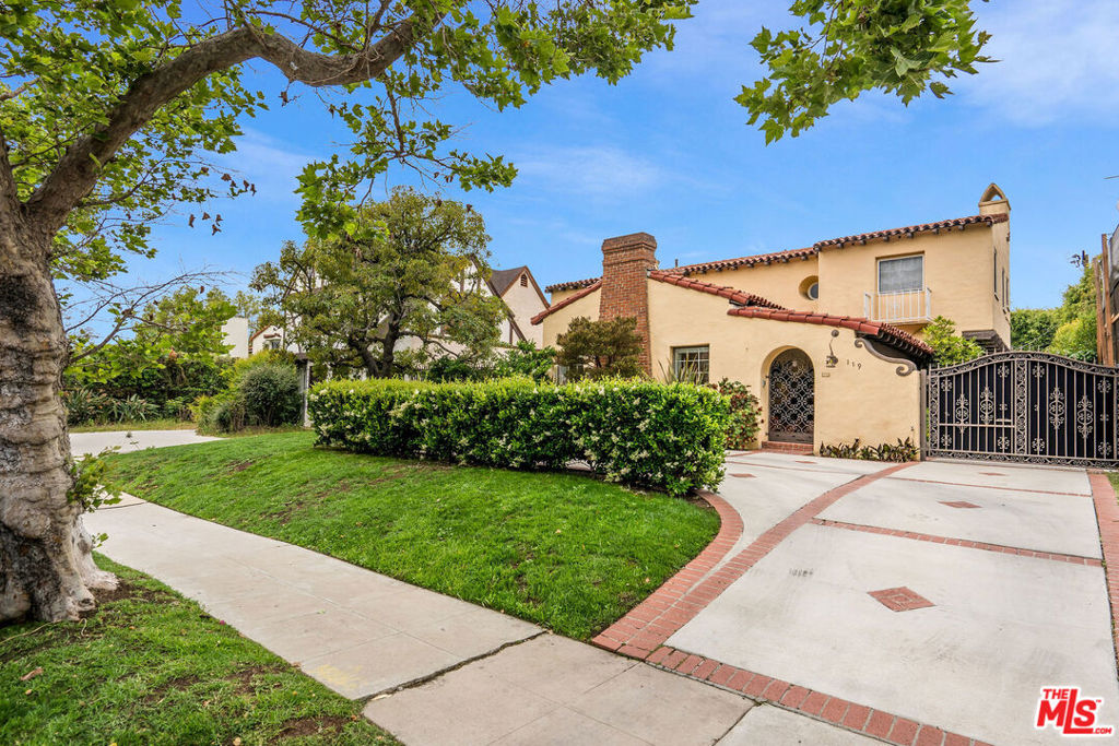 Classic Hancock Park Spanish that’s well-maintained while preserving its charm. A gated courtyard provides exclusion before entering the home, where you step into a brightly-lit living room with vaulted wood-beam ceilings and a fireplace. This leads to a spacious formal dining room with direct access to a private patio. From the dining room you access the breakfast room and kitchen with center island, stone counters and ample cabinet space. Beyond the kitchen is a large family room with great windows and access to the backyard. Rounding out the first floor is an en-suite bedroom plus spacious laundry/utility room. Upstairs are three spacious bedrooms, with hardwood floors under the carpet, highlighted by the primary suite complete with flex space/seating area, ample closet space and a bathroom with period tiles and fixtures. Backyard includes a great patio for al fresco dining plus inviting grass lawn. Long gated driveway provides abundant parking, and leads to a two-car garage, which with heat/air, recessed lighting, and insulation can be used for parking, a home office or gym, or even the beginnings of an ADU. Well located to the cafes, shops and restaurants on Larchmont, Melrose and La Brea; Third Street School District.
