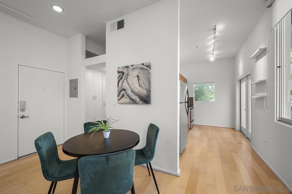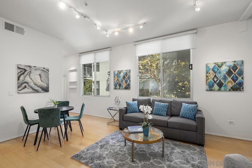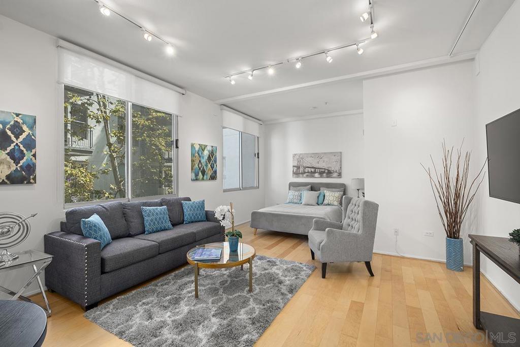This spacious end unit Atria studio is a rare gem, offering abundant natural light and an open atmosphere thanks to its expansive windows, soaring ceiling, and wood floors throughout. Step out onto your private balcony, where tranquil views of lush, mature landscaping in the interior courtyard offer the perfect outdoor retreat. The kitchen offers both style and function, featuring stainless appliances, granite countertops and backsplash, and ample cabinetry for all your storage needs. Additional highlights include track lighting, organized walk-in closet, and a secured parking space. Freshly painted and quietly nestled in the interior of the complex, this studio is one of only three exclusive end units—providing you with a uniquely peaceful living experience. Don’t miss this rare opportunity to own a serene sanctuary in the heart of the Marina District! Residents of Atria enjoy the convenience of on-site management, fitness center, media room, and a rooftop deck complete with barbecue grills and downtown views. Located just steps from Ralphs grocery store, trendy coffee shops, a variety of restaurants, Seaport Village, and the scenic San Diego Bay, Atria offers the perfect blend of urban living and coastal charm.