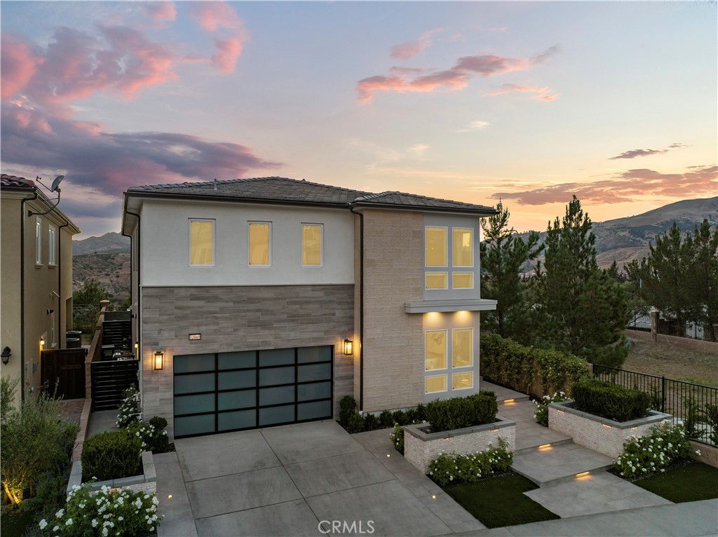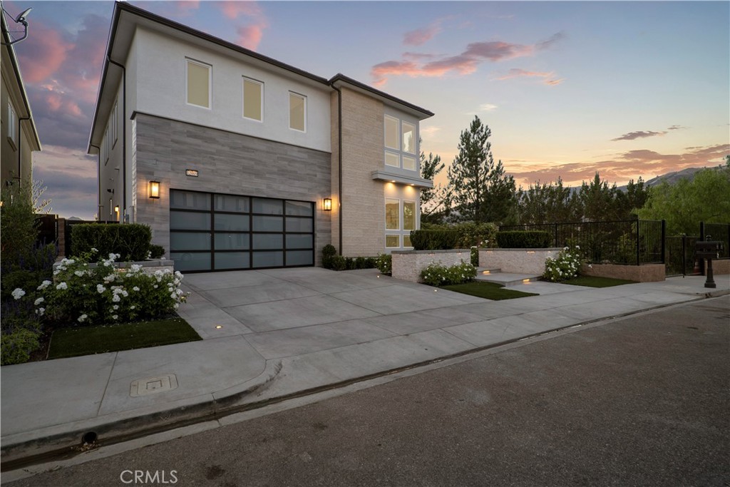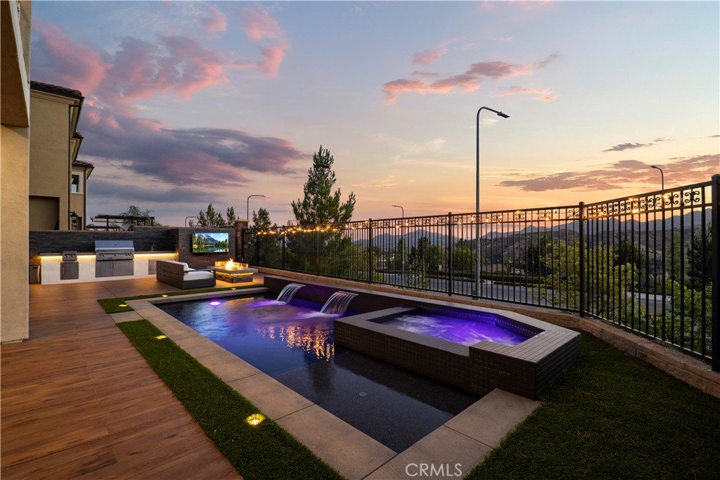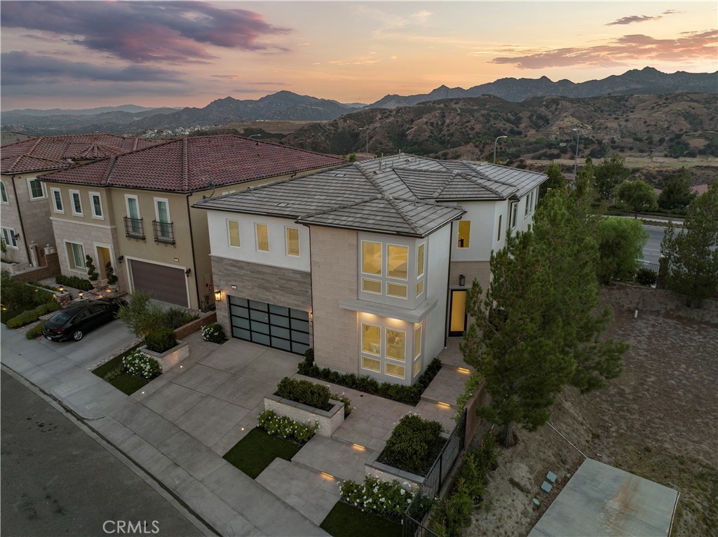 Introducing a magnificent Toll Brothers “Montemar Modern” residence. With an extraordinary video in the virtual tours section and priced to sell this home that was built in 2020 and is situated in the prestigious gated community of Avila. This stunning home offers an open-concept floor plan and showcases unblocked sunset views of the Santa Susana Mountains, creating a breathtaking backdrop to everyday living. With over $450,000 in custom upgrades, this property is designed to impress. Step into the two-story foyer that sets the stage for elegance throughout the home. The 1st floor features a private bedroom with an en-suite bathroom, with a convenient powder room for guests. Hardwood floors throughout both levels of the home, accentuated by crown molding in every room for a sophisticated touch. The main living and dining areas open effortlessly to a luxury outdoor living space through stacking sliding doors, creating an entertainer’s dream setup complete with a built-in cooler, storage, countertop, and outdoor TV. The chef’s kitchen features a large island with custom polished waterfall-edge quartz countertops and floor-to-ceiling cabinetry. A walk-in pantry provides ample storage, while Kitchen aid stainless steel appliances, including a built-in refrigerator, elevate the cooking experience. Custom marble backsplash in both the kitchen and the garage entry drop zone. Upstairs, the master suite is a private retreat with a spacious deck, custom built-in cabinetry, and remote-controlled shades. The spa-like master bath includes a soaking tub, a rainfall showerhead, a custom vanity, and a walk-in closet with built-in cabinetry. The upper level also features Jack & Jill bedrooms, a spacious loft that can double as a custom home theater, and a second-floor laundry room for added convenience. This home comes with owned and paid-off solar, custom shades throughout, a smart thermostat, security camera wiring, and a WiFi doorbell camera. The entertainer’s backyard is a showstopper, featuring a saltwater pool and raised spa with two 24-inch waterfalls, a custom-built Alfresco BBQ station with a dual side burner, a linear firepit, outdoor 55” TV, porcelain tile patio, and low-maintenance artificial turf. The two-car garage is complete with epoxy flooring and 220V outlet for EV charging. Residents of the Avila community enjoy access to a community pool center and the convenience of being within walking distance to PRCS.