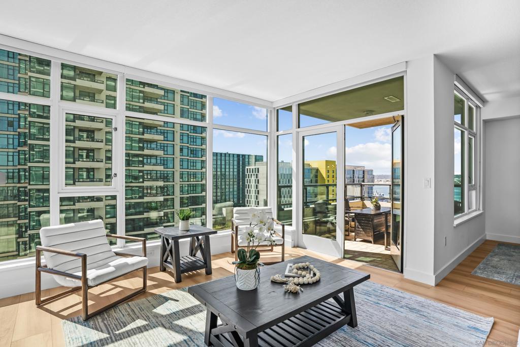 Experience turnkey coastal living in Residence 1505 at The Grande North at Santa Fe Place, a stunning corner residence showcasing views of San Diego Bay, the Coronado Bridge, and the glittering downtown skyline. Expansive walls of windows fill the home with natural light while framing ever-changing waterfront vistas. This beautifully appointed two-bedroom, two-bath residence features rich hardwood floors, an open and inviting living space, and a private terrace perfect for enjoying passing sailboats and the energy of the city below. The chef’s kitchen is thoughtfully designed with GE stainless steel appliances, granite countertops, and generous cabinetry for ample storage. Additional highlights include a full-size washer and dryer, custom window shades, surround sound, and two secured parking spaces. Located in the highly desirable Columbia District, The Grande places residents moments from the Embarcadero waterfront, Little Italy’s renowned dining scene, Seaport Village, and the Gaslamp Quarter. Residents enjoy an exceptional collection of resort-style amenities, including 24-hour concierge and security, a state-of-the-art fitness center, a recently renovated 80-foot lap pool, spa, steam and sauna rooms, bicycle storage, and a fully appointed guest suite with dedicated parking. The elegant Club Room offers a full kitchen, bar, and entertainment lounge.