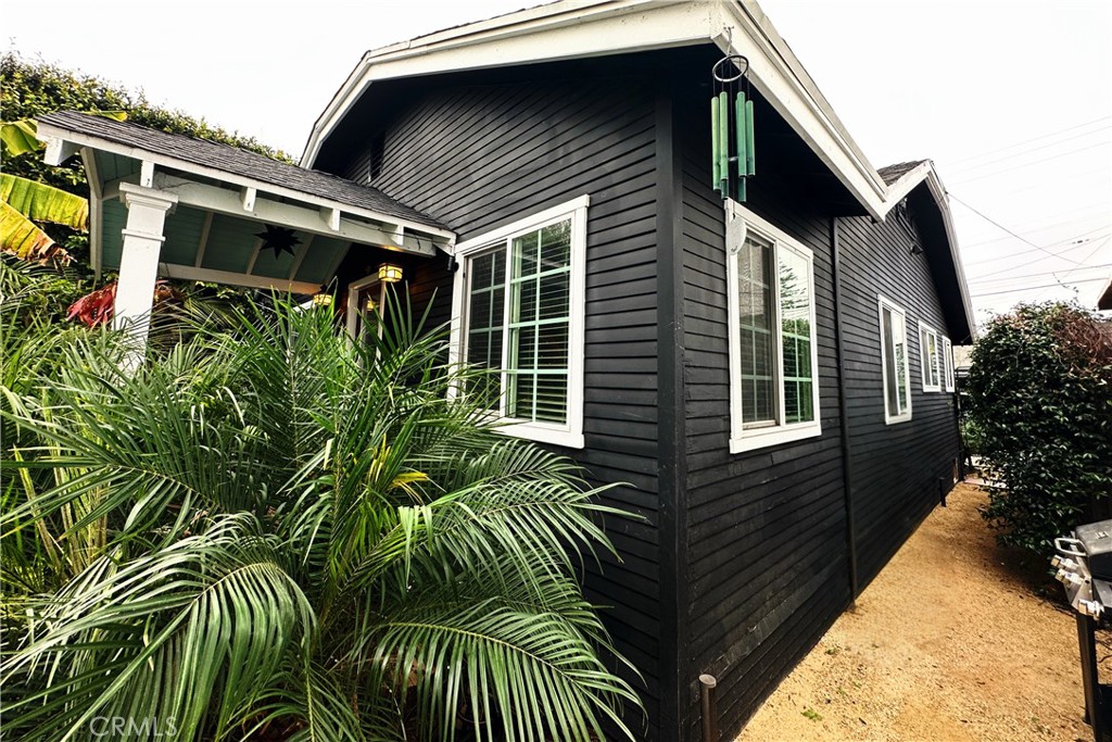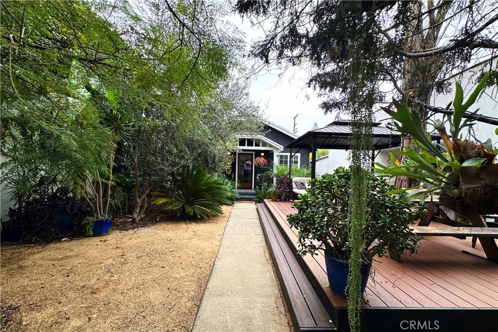 Tucked behind a tall private gate, this striking two bedroom, two bath residence unfolds as a secluded, design forward retreat – a rare blend of privacy, elevated taste, and modern California living. Must see private urban sanctuary, thoughtfully curated and design driven. Finished in a bold black exterior with crisp white trim, the home makes an immediate architectural statement while remaining quietly hidden from the street. The front garden is a true showpiece: carefully landscaped with decomposed granite pathways, mature palms, and olive trees. Anchored by a pergola covered al fresco lounge with a large seating area and outdoor television – a magical garden setting ideal for entertaining or relaxing outdoors. Inside, an open and airy floor plan seamlessly connects the living, dining, and kitchen areas, creating an effortless flow for both daily life and gatherings. The home has been extensively upgraded with refined taste, including a modernized kitchen, beautifully remodeled bathrooms (one highlighted by a skylight and verdant accents that bring natural light and warmth into the space), refreshed flooring, and a fully repainted interior and exterior. Two well proportioned bedrooms offer versatility for guests or home office use, thoughtfully positioned within the home’s flowing layout. Indoor outdoor enjoyment continues through the rear deck, designed for relaxed entertaining and easy movement between spaces. An outdoor shower with hot water adds a resort like coastal touch, while the adjacent laundry room is discreetly positioned for convenience. A detached one car garage, two on site parking spaces, and a custom mural by a surf artist add both function and creative identity. Major system upgrades include a rebuilt sewer line, updated electrical, earthquake retrofitting, tankless water heater, central fan system, and irrigation system. Ideally located near SoFi Stadium, the Forum, Intuit Dome, and the upcoming 2028 Olympics, the property offers exceptional access without the burden of traffic or disruption.
