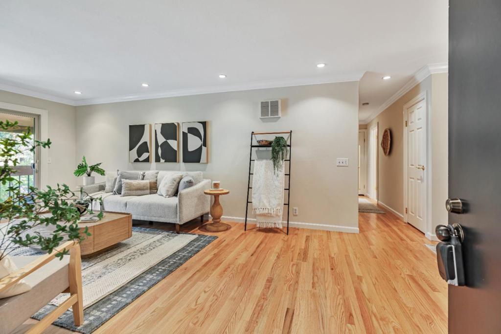 This immaculate, attention to detail updated light-filled 2-bedroom, 2-bathroom second-story unit offers serene treetop and central courtyard views, facing the inviting heated pool. Step onto your private balcony and into a beautifully updated space featuring a fully remodeled open kitchen with custom white Thomasville cabinetry, Kohler fixtures, Carrara countertops, white Venetian glass tile backsplash, and brand-new stainless steel appliances. The living room showcases newly installed natural oakwood flooring with eco-cork underlayment for sound reduction, complemented by refinished hardwood floors throughout and new baseboards in the living and dining areas. Both bedrooms feature brand-new, natural wool Berber carpeting from New Zealand, offering comfort and sustainability. The master suite includes a walk-in closet and an updated ensuite bathroom with dual sinks. Every room, including closets, has been professionally painted in a warm neutral with crisp Swiss Coffee trim and crown molding for a timeless finish. Enjoy the easy lifestyle with access to beautifully landscaped common areas, a heated pool, BBQ area, clubhouse, laundry facility, and a private parking garage. Just minutes from vibrant downtown, Fisherman’s Wharf, and scenic coastal walking and biking trails.