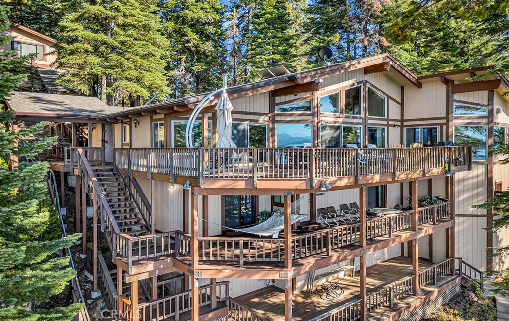 This stunning lakefront home offers panoramic views of Lake Almanor and Mount Lassen, just steps from Recreation Area 2 in Lake Almanor Country Club. With three levels of waterfront decks, a deep-water lot, and a large solar U-shaped dock with a boat slip, two wave runner slips, and two buoys, it’s the ultimate lakefront retreat. A 3-seat tram transports you and your groceries to the lake, and covered, lighted walkways provide year-round comfort. Inside, you’ll find exquisite woodwork and master suite with 180-degree lake views, a cozy fireplace, and a luxurious-suite bathroom. The main floor also has a spacious deck and a jacuzzi room with redwood walls. The Great room features two-story windows, another fireplace, and seamless flow into the kitchen with granite countertops, stainless steel double ovens, and modern finishes. The lower level includes three bedrooms, two with deck access. Above the detached 2-car and golf cart garages is a charming apartment with lake views, two bedrooms, a full kitchen, and a wood stove. Enjoy amenities like summer bandshell concerts, pickleball, tennis, and more in this family-friendly community. This property is a true lakeside paradise, perfect for making lifelong memories!
