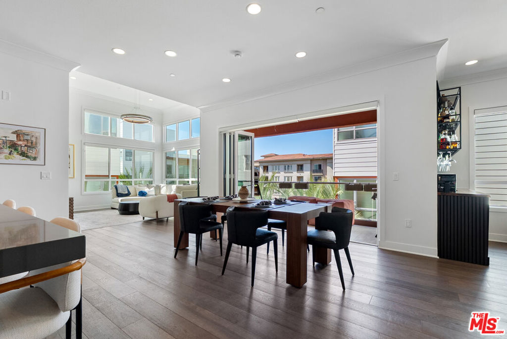 Stunning single-level Skylar penthouse featuring soaring ceilings and an expansive open floor plan. Step inside to an abundance of natural light, highlighted by gorgeous wide plank hardwood flooring throughout. The chef’s kitchen is beautifully appointed with top-of-the-line stainless steel Thermador appliances, an oversized center island with striking pendant lighting, marble backsplash, and a walk-in pantry. The kitchen flows effortlessly into the dining area, where accordion doors open to an oversized patio, creating a seamless indoor-outdoor living experience. Just beyond the dining space is a spacious living room with dramatic high ceilings and large windows that flood the home with light. Retreat to the luxurious primary suite featuring two walk-in closets and a contemporary bathroom complete with an elegant glass barn door, soaking tub, glass enclosed shower, and dual sink vanity. On the opposite side of the home are two generously proportioned bedrooms, one featuring a custom Murphy bed, connected by a modern Jack and Jill bathroom. Additional amenities include a fully renovated powder room, a custom built-in bar with a wine fridge, a generous laundry room with a new washer and dryer, a private two car garage with built-in storage and an EV charger, solar panels, and exceptional privacy as the only residence on the top floor. Enjoy the best of Playa Vista living at Osprey Ln, just moments from shops, dining, parks, and everything this vibrant community has to offer.