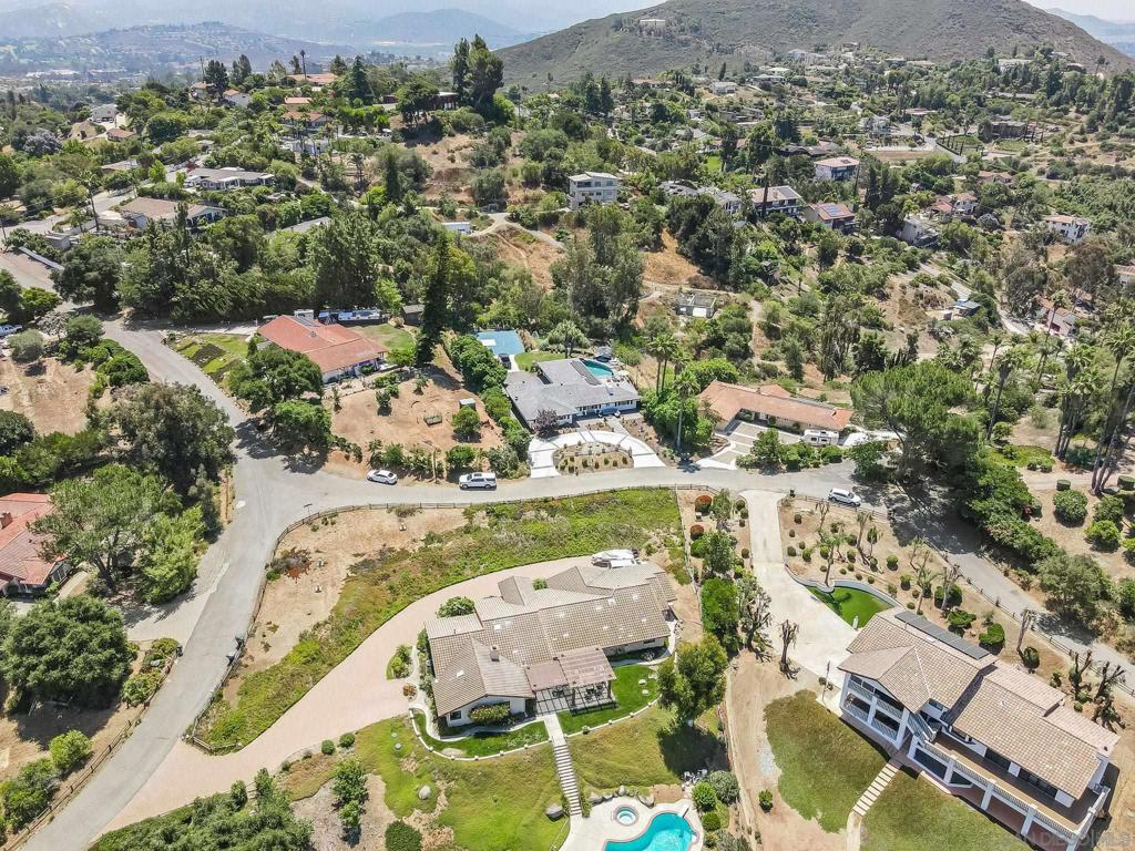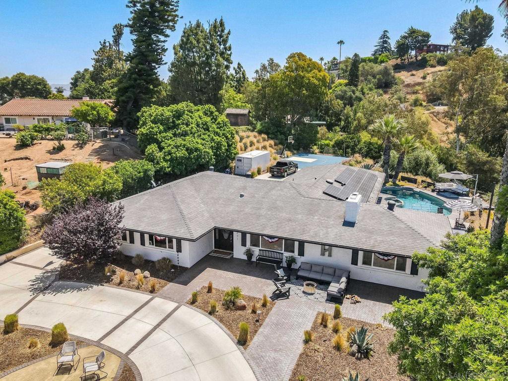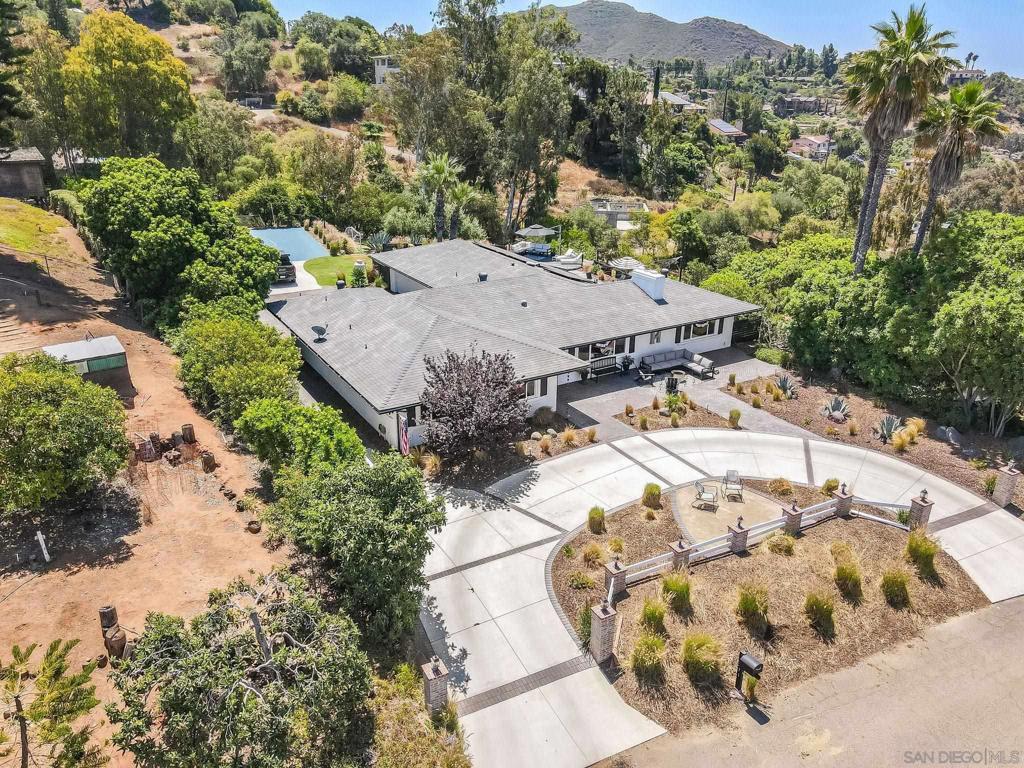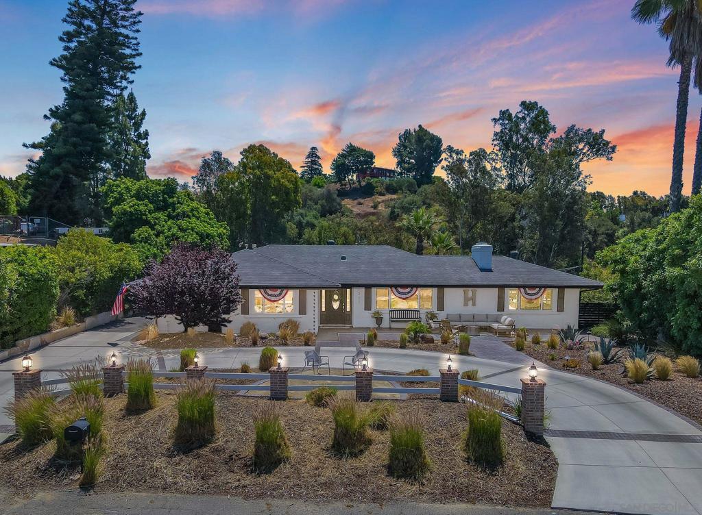 Welcome to your dream retreat in the heart of Lake Hodges! Nestled on a quiet cul-de-sac, this exquisite single-level custom home offers breathtaking panoramic mountain and park-like views. With meticulous attention to detail and top-notch upgrades, this residence seamlessly combines elegance with comfort. Step inside to discover a beautifully remodeled kitchen featuring a striking combination of quartzite countertops on the kitchen island and quartz countertops throughout the rest of the kitchen. The kitchen is outfitted with sleek GE Cafe appliances in stunning white with gold finishes, a Whirlpool dishwasher, a wine refrigerator, and a convenient under-island sliding microwave. Enjoy the seamless indoor-outdoor experience with La Cantina sliding doors and windows that open up to the serene vistas. The home boasts travertine and wood flooring throughout, providing a warm and inviting ambiance. Dual pane vinyl clad windows and doors enhance energy efficiency and flood the interior with natural light. The updated baths, crown molding, and newer lighting and hardware add to the home’s refined appeal. The centerpiece of the living space is a stunning dual-sided fireplace, creating a cozy atmosphere that opens on both sides to both living room areas. Whether you’re hosting gatherings or enjoying quiet evenings, this feature is sure to impress. See supplement Convenience is key with the inclusion of a functional mudroom, perfect for organizing daily essentials and keeping the home tidy. Additionally, the garage features dual side openings to the backyard, currently utilized as a versatile gym and entertainment room, offering a flexible space to suit your lifestyle. Step outside to your private oasis—a built-in pool and spa surrounded by towering palms, ideal for relaxation and entertaining. The expansive outdoor area features a built-in grill, a countertop fire pit, and an additional fire pit by the pool. Enjoy your evenings on the deck, play on the half-court basketball area, or let the kids run on the turf space designed for soccer and play. There’s even a wood-burning fireplace below for those cozy nights. This home is equipped with paid for solar and Sonos throughout the house and outdoor areas, ensuring your favorite music accompanies every moment. With breathtaking sunset views and air conditioning for comfort, this home is truly exceptional. Sellers have plans for a second story. Don’t miss the opportunity to own this remarkable home in the sought-after Lake Hodges area. With its perfect blend of luxury, comfort, and stunning surroundings, this residence is a rare find.