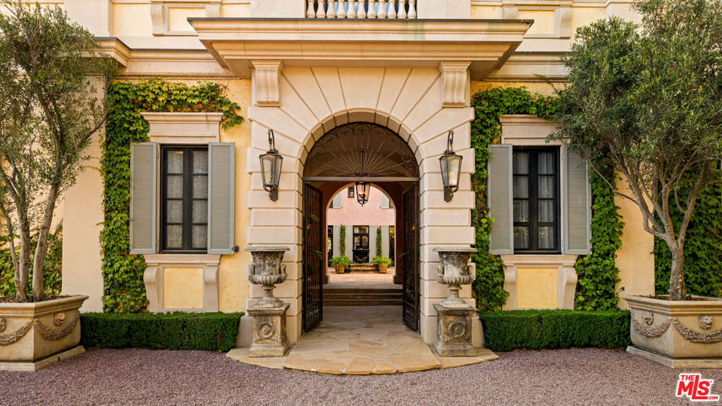 Set within the ultra-exclusive enclave of Brentwood Country Estates, a guard-gated community of just thirteen residences celebrated for 24/7 security, privacy, and sweeping vistas, this remarkable estate evokes the timeless romance of a European chateau. Encompassing approximately 9,400 square feet of living space on an expansive 6.13 acre lot, the property offers a rare combination of seclusion, scale, and architectural elegance. A private gate opens to a stately gravel motor court, instantly transporting you to the Tuscan countryside. Beyond an arched entry, a central courtyard unfolds, where vined walls, manicured gardens, a serene fountain, and flagstone pathways create an atmosphere of refined tranquility. Inside, the residence reveals exceptional craftsmanship throughout, featuring intricate marble floors, soaring ceilings, and the classic proportions of a true European manor. A dramatic two-story formal living room with stone fireplace and coffered, beamed ceilings flows seamlessly into an elegant formal dining room. The chef’s country kitchen is anchored by a substantial center island, professional-grade appliances, and opens to both a charming breakfast room and an inviting family room with fireplace. A richly appointed wood-paneled office and library, two powder rooms, a guest suite, a generous playroom or bonus room, and a large, dedicated storage space thoughtfully positioned between levels enhance the functionality of the main residence. Upstairs, the primary suite serves as a private sanctuary, offering a fireplace, walls of French doors opening to a romantic terrace, dual custom walk-in closets, and a luxurious spa-like bath. A dedicated gym and three additional en-suite bedrooms provide comfort and flexibility. The resort-quality grounds are truly exceptional, featuring expansive lawns, covered patios, a sparkling pool and spa, and a rotunda gazebo crowning the landscape. Below the gazebo, a temperature-controlled wine cellar and tasting room accommodating approximately 1,000 bottles create an intimate setting for entertaining. From nearly every vantage point, sweeping canyon and ocean views stretch endlessly, forming a breathtaking natural backdrop. A rare offering of grace, grandeur, and security, 12721 Chalon Road is a world-class European retreat nestled in the heart of Brentwood.