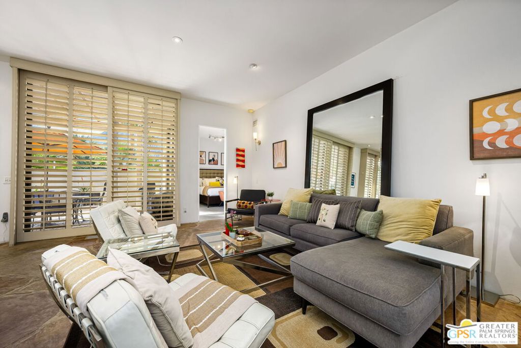 Welcome to the sought after Club Condominiums in Palm Springs! Once part of the legendary Palm Springs Racquet Club this complex was home to Hollywood greats like Joan Fontaine, Tab Hunter, one of the Gabor sisters and even members of the Rat Pack! Elegant unit….the open floor plan is great for entertaining and the private pool is the icing on the cake!! Gorgeous outdoor space with mountain views. The unit features high ceilings, floor-to-ceiling window, terrazzo tile flooring in both bedrooms. And both bedrooms are en-suite! There is a gas fireplace in the primary. The kitchen has been gorgeously remodeled and has a huge window over the sink. The vibe is Mid-Century but the luxuries are right now. And it’s on fee land! Come take a look at this truly lovely condo.