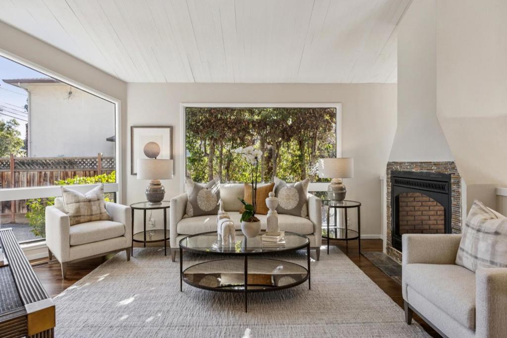 Bold geometric forms define this chic contemporary home just a stones throw from downtown Menlo Park. Soaring ceilings expand the sense of interior space while oversized angular windows capture shifting sunlight. The open concept living area with its striking architectural lines is highlighted by a double sided electric fireplace beautifully separating the space for living and dining. A traditional, built-in sideboard compliments the recently remodeled kitchen. Both the kitchen and dining areas open to the inviting garden patio. The floor plan is arranged with the primary and a second bedroom, each with their own balcony, and a shared a bathroom on the upper level. The third or guest bedroom and additional full bath provide versatility on the main level. With solar panels, a heat pump, electric water heater and induction stove, the eco friendly buyer will be perfectly at home. This home is the front one of two homes located on a shared lot, close to all of the amenities of vibrant downtown and provides access to excellent Menlo Park schools!
