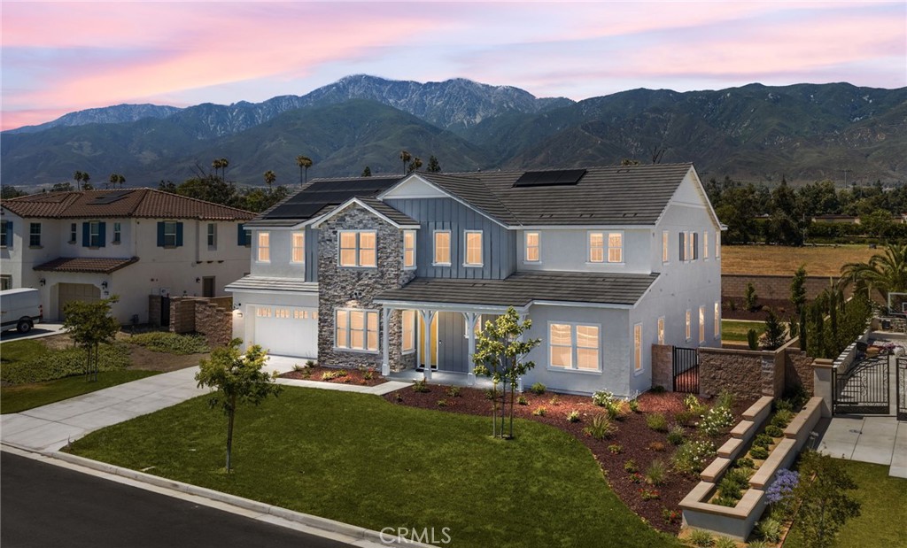 Welcome to 13428 Silver Sky Rd, where luxury, comfort, and thoughtful design come together in perfect harmony. Built in 2023 and masterfully upgraded, this exquisite residence sits in one of Rancho Cucamonga’s most desirable new communities, surrounded by beauty, serenity, and mountain views that steal the show. From the moment you step inside, you feel it: The spaciousness, the light, the calm sophistication that only a truly special home can offer. The chef’s kitchen is the heart of it all, designed for both everyday living and elevated entertaining, featuring an oversized waterfall island, high-end appliances, and a layout that flows effortlessly into the indoor-outdoor living spaces. The backyard is lush, private, and expansive – perfect for summer gatherings, peaceful mornings, and even your future dream pool. The open floor plan offers over 4,700 square feet of living space, with 5 bedrooms, a generous loft, and a bonus room that’s ideal as a home office, gym, or playroom. Downstairs, a private bedroom and bonus room create the perfect setup for multigenerational living. Upstairs, the primary suite is pure indulgence: A retreat with breathtaking views, a spa-inspired bathroom, and a custom walk-in closet that feels like a boutique. Every detail has been thoughtfully curated, from the designer lighting and fresh paint to the epoxy-finished 3-car garage with custom cabinets, potential room for RV parking, whole-house water filtration system, and paid-off solar. Located just minutes from Victoria Gardens, top-rated Etiwanda schools, parks, and dining. This is more than a home; it’s where beauty meets function, luxury meets ease, and every day feels just a little more elevated. Come experience the feeling of coming home to everything you’ve worked for and everything you’ve dreamed of.