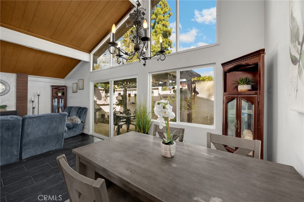 Beautiful updated condo featuring vaulted ceilings, a fireplace, new windows and 8 month old A/C condenser unit and coils for year round comfort. Inside you will find stylish black tile flooring, a bright white kitchen with stainless steel appliances, and quartz style countertops. Two separate sink areas and a stone walk in shower complete the main bath area. Additional sink/dressing area located off of the primary has new tile floors and quartz style counters. A functional layout that feels both modern and inviting. This home also includes a full size laundry room with additional cabinet space. Enjoy outdoor living with your own private patio, plus the benefit of a one-car garage. Ideally located just a few steps from the community pool, making it easy to relax and enjoy the amenities. Located close to freeways, shopping, and restaurants.