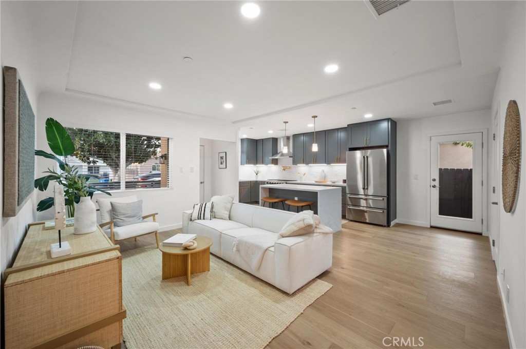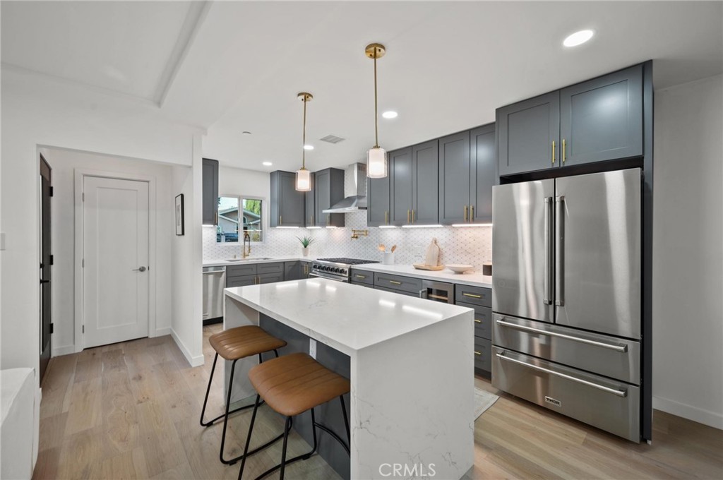 Tucked away on a lush, tree-filled lot, this modern retreat offers the perfect balance of privacy and resort-style living. A remote-controlled iron gate opens to reveal a beautifully reimagined 5-bedroom, 4-bathroom home showcasing timeless design and high-end upgrades throughout. Inside, the open-concept floor plan is anchored by White Oak hardwood floors and a sleek designer kitchen with quartz countertops, under-lit cabinetry, matching Thor appliances, and a built-in three-temperature wine refrigerator. The expansive primary suite overlooks the serene backyard and features a spacious walk-in closet along with a spa-inspired ensuite highlighted by dual sinks and a curb-less, zero-entry shower. Three additional designer bathrooms echo the same attention to detail with walk-in showers and luxury finishes. Step outside to your private paradise: a brand-new sparkling pool shaded by mature trees and complemented by a resort-style cabana. Designed for entertaining, the cabana is complete with an outdoor kitchen, built-in Spires BBQ, dual-temperature wine fridge, mounted TV, overhead lighting, and a cozy fire pit. Recent upgrades provide peace of mind, including a new roof, HVAC system, water heater, all-new copper and PEX plumbing, smooth stucco exterior, stamped concrete driveway, and low-maintenance synthetic turf in both the front and back yards. A rare blend of sophistication, comfort, and modern California living, this home is a true retreat designed for both relaxation and entertaining.