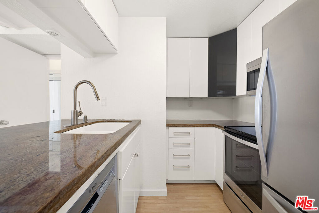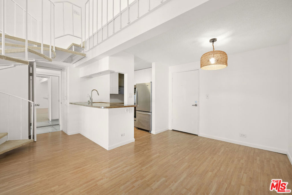This beautifully upgraded 2-bedroom loft condo offers peaceful living in the desirable Colony Complex, known for its boutique hotel atmosphere. The spacious open floor plan features soaring vaulted ceilings, a Juliet balcony with serene pool and koi pond views, and a sleek kitchen with modern appliances, breakfast bar, and dining nook. The first-floor en-suite bedroom includes vaulted ceilings, custom closet organizers, and a contemporary bathroom. Upstairs, the versatile loft space, perfect for an office or guest room, includes a skylight and motorized blackout shade. Building amenities include a newly upgraded fitness center, steam room, sauna, party room with catering kitchen, and lush outdoor spaces with waterfalls, koi ponds, heated pool, and spa. Across the street, enjoy a park with tennis, basketball, and soccer courts. Convenient features include on-site EV car charging, bike storage, assigned parking, and HOA fees covering utilities. Just minutes from UCLA, shops, dining, Westwood Village, and the upcoming subway, this condo combines luxury with urban convenience.