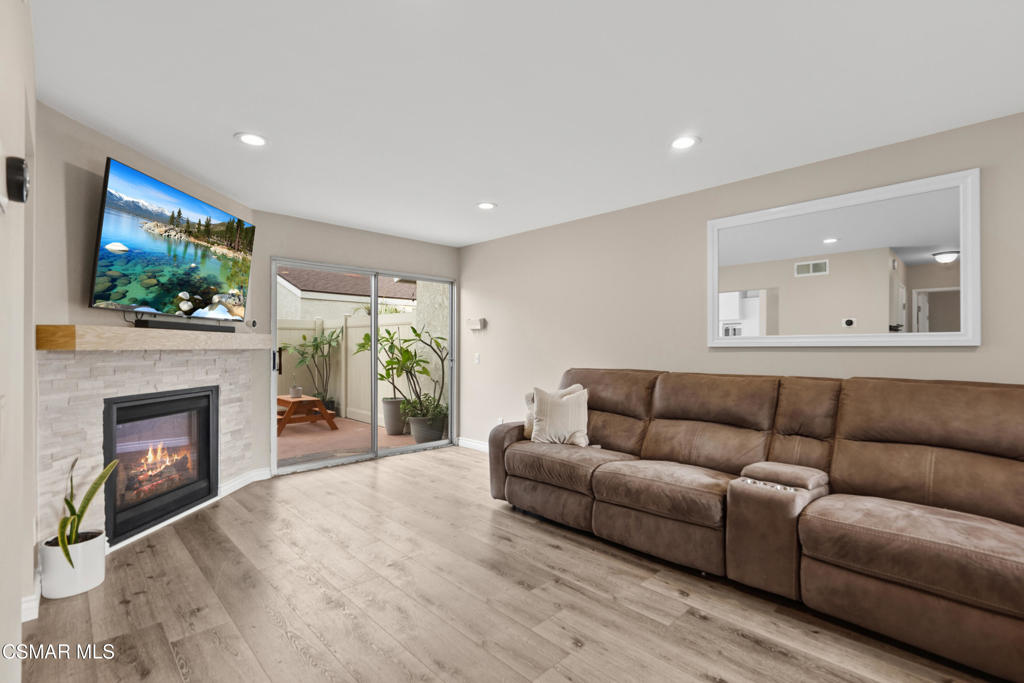 Located in the highly desirable Varsity Park community, this rare 4-bed, 2.5-bath townhome offers space, style, and a tranquil setting. Step inside to a light-filled open floor plan highlighted by wide-plank wood-like flooring and recessed lighting throughout the main living areas. The spacious living room features a stunning stacked-stone fireplace with a custom mantel and flows seamlessly through sliding glass doors to a private rear patio–creating the ideal indoor-outdoor lifestyle.The kitchen showcases crisp white cabinetry, stainless steel appliances, generous counter space, and a breakfast bar that opens to a spacious dining area–perfect for both everyday living and entertaining. The versatile layout includes a convenient downstairs bedroom and powder bath, ideal for guests, a home office, or multigenerational living. Upstairs, three additional bedrooms await, including a spacious primary suite with dual closets and abundant natural light. Additional highlights include central A/C, an in-unit laundry closet, and a 2-car detached garage with direct access to the back patio. Varsity Park offers lush greenbelts, mature trees, and two sparkling pools–providing a peaceful retreat just moments from everyday conveniences. Ideally located near shopping, parks, Moorpark College, and with easy access to the 118 and 23 freeways, this home delivers the perfect balance of comfort, convenience, and community. Welcome home!
