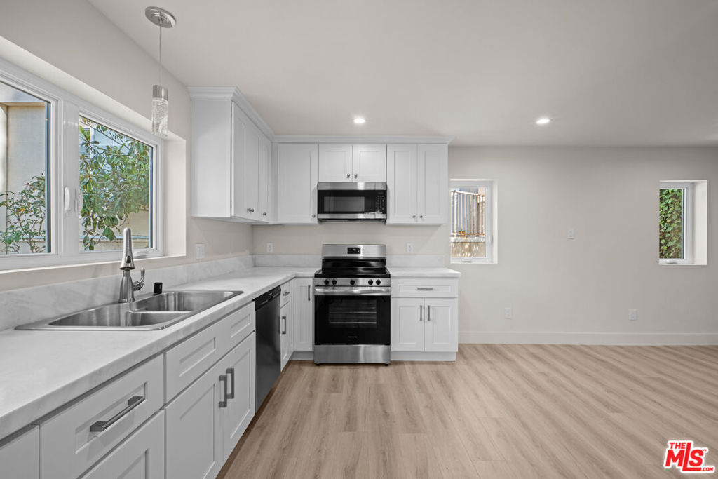 This newly renovated 2-bedroom, 2-bath ADU offers a bright open-concept layout with clean contemporary finishes throughout. The updated kitchen features white cabinetry, stainless steel appliances, and ample counter space, flowing seamlessly into the living area. The bathroom is thoughtfully designed with a sleek walk-in shower and modern fixtures. Light wood flooring, recessed lighting, and a private feel make this unit both stylish and functionalideal for comfortable, modern living.