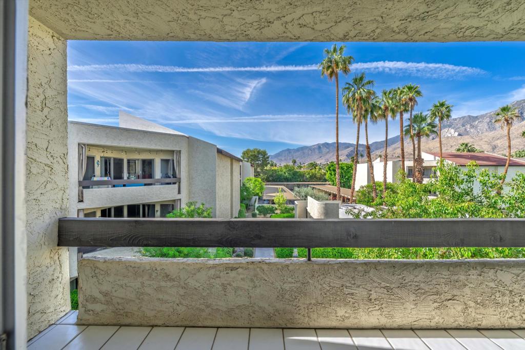 Views Views Views of Indian Canyons from your living room, bedroom and balcony in this top floor condo at the Biltmore Phase III in beautiful South Palm Springs. The carpeted living area and bedroom both have sliders to access the balcony. The large bedroom features a wall of reach-in closets with sliding mirror doors with additional closet storage in the hallway. The bathroom accessible from both the hallway and the bedroom has a bathtub/shower.Updated galley style kitchen with tile flooring with a pass thru for entertaining to the dining area. Entire condo refreshed with new paint throughout and new vertical window blinds. HVAC system was replaced. Perfect for full-time, second home or investment/vacation rental (30-day rental or longer allowed). One pet allowed. Features: one assigned carport, storage locker, community laundry rooms on each floor, building intercom access and lots of guest parking. The HOA has recently completed several major projects: resurfaced the roofs, replaced the elevators, new fire alarm system, new common area AC chillers and fans and resurfaced the spa. Starting 9/30/25 HOA fee will include Frontier high speed internet for 1-year.Relax in the inviting and refreshing pool and spa with mountain views. Enjoy entertaining and outdoor dining in the HOA cabana with misters and BBQs.Close to downtown Palm Springs, near Del Rey at the Villa Royale, Koffi, Kings Highway, The Reef Bar, Sancho’s Mexican, Elmers, El Mirasol, Mr. Lyons, Kreem Ice Cream. Palm Springs living at its Best! Photos with furniture are virtually staged.
