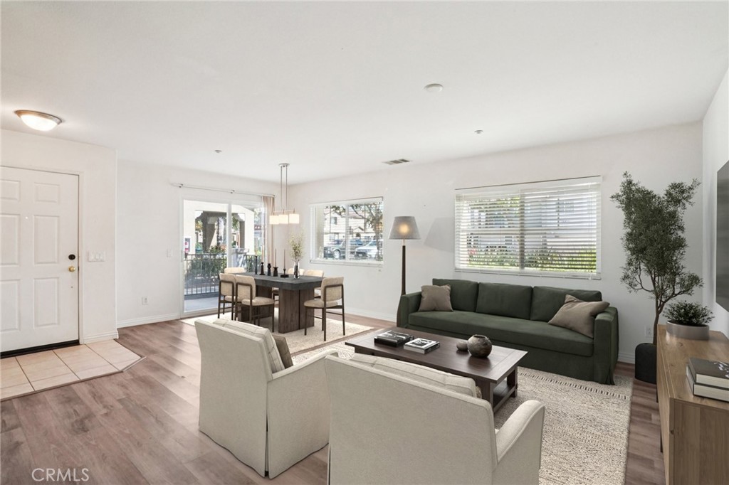 Welcome to this spacious residence in the sought-after Palacio De Oro community, offering comfort, convenience, and modern living. Go inside to find an inviting open-concept layout where the living, dining, and kitchen areas flow seamlessly together—perfect for entertaining or everyday living. The home features laminate flooring, a main-level bedroom and full bathroom, plus a private gated front patio with direct access from the dining area—ideal for outdoor dining or morning coffee. Upstairs, the huge primary suite impresses with a spacious walk-in closet and en suite bathroom with dual vanities, while an additional bedroom and bathroom provide plenty of space for family or guests. Enjoy the benefits of an attached 2-car garage, and take advantage of the community’s amenities including outdoor cooking and picnic areas surrounded by beautifully landscaped grounds. Conveniently located near markets, schools, and dining options, this home offers the perfect blend of style and practicality.