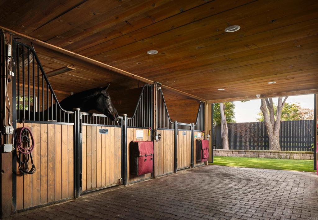 Masterfully crafted with intention and thoughtful design, this exceptional gated Rancho Santa Fe estate offers a premier setting for both elite riders and luxury living. Designed to support top competitive horses year-round, the professional equestrian facilities feature premium ebb-and-flow footing for optimal performance and conditioning in every season. The barn includes 8 stalls with the option to expand to 10, complemented by four lush grass pastures, a round pen, and a full-size dressage court with perimeter track and a dedicated arena viewing deck. Additional equestrian amenities include groom’s quarters, a hay barn, and a state-of-the-art well system supplying the home, horses, and irrigation, complete with a water filtration system and a 3,750 gallon storage tank for added efficiency and reliability. The main residence blends comfort and sophistication, offering dual primary suites, four bedrooms total, and two private offices, ideal for work-from-home flexibility or estate management. A separate guest home provides complete independence with a full kitchen, living area, and two bedrooms, perfect for extended family, trainers, or visitors. Resort-style grounds elevate the lifestyle experience with a modern pool and spa, centrally positioned to create a natural gathering space and indoor-outdoor focal point of the home. Designed for effortless entertaining, the space includes alfresco dining, a fully equipped outdoor BBQ area, and a built-in pizza oven. Additional amenities include a professional putting green with premium turf, a dedicated golf room featuring a top-of-the-line TrackMan simulator, an owned solar system for energy efficiency, EV charging stations, a four-car garage, and abundant additional parking.