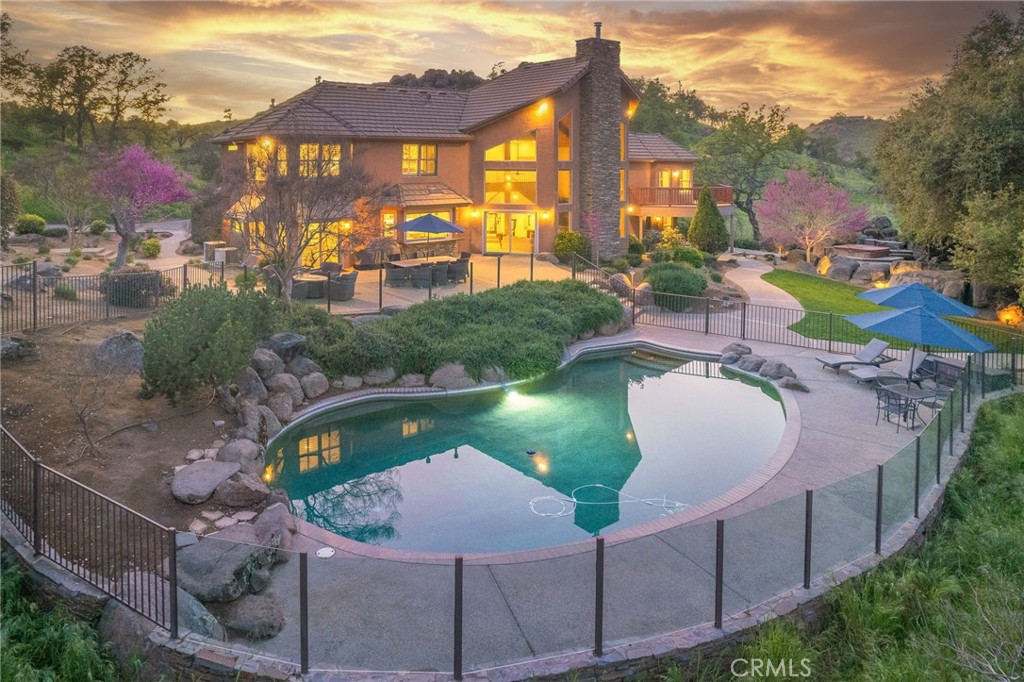 Custom-built by Erickson Construction, this impressive estate sits on a sprawling 20-acre parcel in the gated Quail Oaks II community and offers sweeping views of the Sierra Nevada mountains. The west-facing home enjoys beautiful sunsets, a seasonal pond, and the added convenience of a separate private gate, creating a setting that feels both peaceful and private. Inside, the home has been thoughtfully refreshed with resurfaced plaster-finish walls, fresh paint, and newly installed luxury vinyl plank flooring. The spacious kitchen was beautifully remodeled and is designed for both everyday living and entertaining, featuring leathered granite countertops, a large center island, a walk-in pantry, and a picture window that frames the surrounding landscape. Premium appliances include a built-in refrigerator, wine fridge, ice maker, and additional beverage refrigeration. The flexible floor plan offers multiple dedicated bedrooms, a private office, and a generous flex room ideal for a media room, gym, or game space. Updated lighting, sconces, and ceiling fans throughout the home add warmth and style. Outside enjoy a PebbleTec pool surrounded by an elegant glass-paneled safety fence, perfect for relaxing while taking in the open land and mountain views. Additional highlights include a spacious four-car garage, multi-zone HVAC system, and owned solar for energy efficiency. Located within the highly regarded Clovis Unified School District and zoned for agricultural-residential use, this exceptional property offers the rare combination of luxury living, privacy, and wide-open space within a gated community