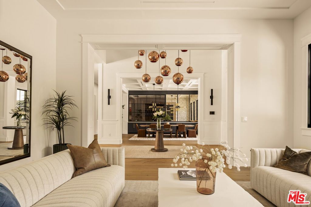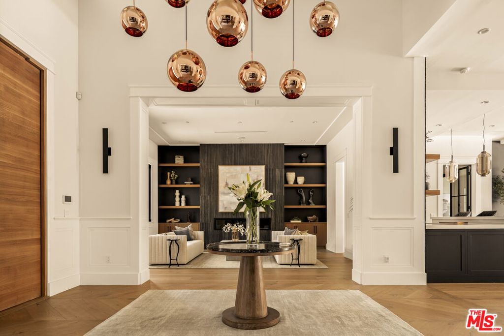 Privately gated and set at the end of a tree-lined cul-de-sac in Encino’s coveted Royal Oaks enclave, this California Contemporary estate offers over 10,000 square feet of next-level luxury and exceptional privacy. A grand pivot door opens to a soaring foyer crowned by 25-foot ceilings, chevron white oak floors, and a spectacular radiant rose-gold chandelier, a dramatic introduction to the home’s refined elegance and effortless style. The thoughtful layout is designed for both intimate gatherings and grand entertaining, with a glass-enclosed wine cellar beside the formal dining room, a living room that dissolves into the outdoors through retractable glass walls, and an effortless flow to resort-style grounds with a shimmering pool, sport court, and shaded lounge. The chef’s kitchen is a stunning culinary atelier where dual quartz islands anchor the space, gleaming porcelain floors reflect natural light, and a coffered ceiling adds architectural drama. Upstairs, the primary suite is a private retreat with stone-framed fireplace, secluded balcony, boutique-style dressing room, and spa-inspired bath. Above it all, a rooftop lounge frames unforgettable sunset skies. For pure escape, the bespoke home theater delivers cinematic magic, while a separate 1,700-SF two-story guest house with two bedrooms, a gourmet kitchen, and sunlit living spaces extends the estate’s seamless expression of elevated modern living, and design.