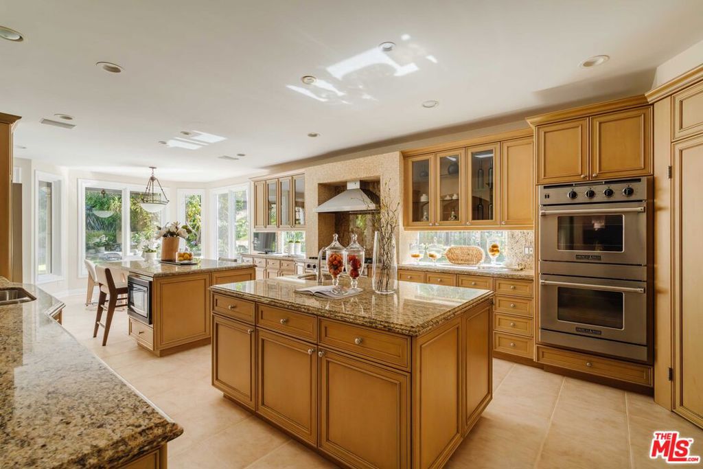 Nestled on a coveted street in the Palisades Highlands, this private residence blends timeless design, thoughtful expansion, and one of the neighborhood’s most exceptional backyards – all on over three quarters of an acre. Guests are welcomed beneath a grand two-story foyer, flanked by a stately formal living room with a fireplace set beneath vaulted, beamed ceilings. Beyond the spacious family room, the chef’s kitchen features dual islands, top-of-the-line appliances and an informal dining area overlooking the serene landscape – opening seamlessly to the backyard. Down the hall, find a large formal dining room, study/office, and a media room with an ensuite bath that can serve equally well as a theater or secondary downstairs guest room. Completing this level are the laundry room, guest room, and direct garage access. Upstairs, discover three bedroom suites, including a stunning primary wing. This expansive retreat offers a large bedroom under vaulted ceilings with backyard views from a private balcony, two walk-in closets, and a luxurious bath with dual vanities, a soaking tub, and an oversized steam shower. One of the guest suites includes its own den/play area that could easily double as a fourth upstairs bedroom or secondary office. The resort-like backyard is a true highlight, showcasing a custom pool and spa, waterfall, putting green, heated loggia with fireplace for dining or lounging, manicured landscaping, BBQ area, and a private walking trail leading to multiple view decks. Residents enjoy access to incredible hiking trails as well as the Highlands recreation center with tennis courts and a forthcoming clubhouse with pool. With its welcoming atmosphere and strong sense of community, the Highlands continues to thrive – especially on this street, where most homes remained untouched by the fire.