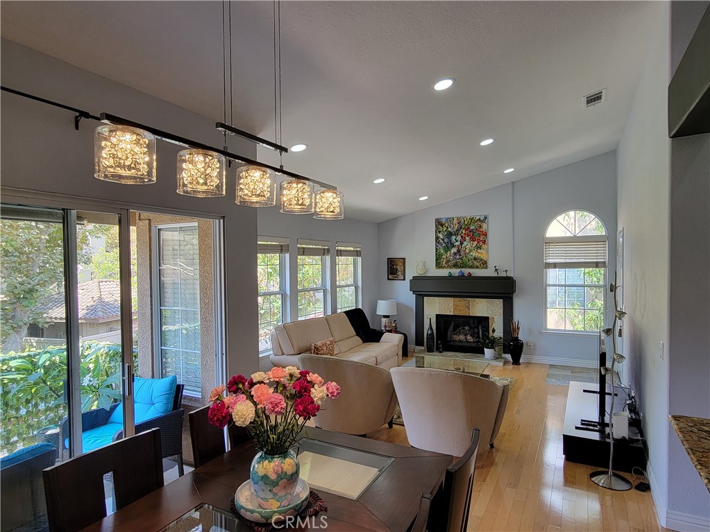 EXCEPTIONAL END UNIT LOCATION AND RENOVATED THROUGHOUT! Unobstracted views of mature trees and greenbelts. Light, bright & airy floor plan offering a spacious living and dining room with engineered Mannington hickory hardwood floors, 5″ custom baseboards throughout, designer interior paint/wallpaper & stone accented fireplace, large windows allowing for plenty of natural light, and sliding glass door to lovely outside balcony perfect to enjoy your morning coffee. Major remodeling took place 2022 top off the highlights of this fantastic property. Spacious kitchen boasts recessed lighting, Brazilian granite counter tops with full back splash, stainless steel appliances, Kohler sink and designer faucet, custom stained cabinets & glass front cabinets with lighting. Large master suite with mirrored closet doors with custom shelving and inside lights, plenty of windows with high-end drapery, remote controlled ceiling fun with lights. Master bathroom featuring a large vanity with new toilet and dual sinks, upgraded fixtures, custom stained cabinets, new mirrors, quartz counter tops and marble flooring. Second bedroom offers mirrored closet doors, shelving, recessed lights, modern custom paint. Full hall bathroom with custom stained cabinet, upgraded fixtures and tile flooring. Large hall closets and linen cabinets, separate laundry room with lots of cabinet space and tile flooring, newer water heater, new AC motor (2024), direct garage access, re-piped as of 2018. All this plus excellent proximity to Aliso Viejo Town Center with shopping and entertainment, easy toll road (73) and beach access, highly sought after schools and nearby hiking, biking and nature trails!