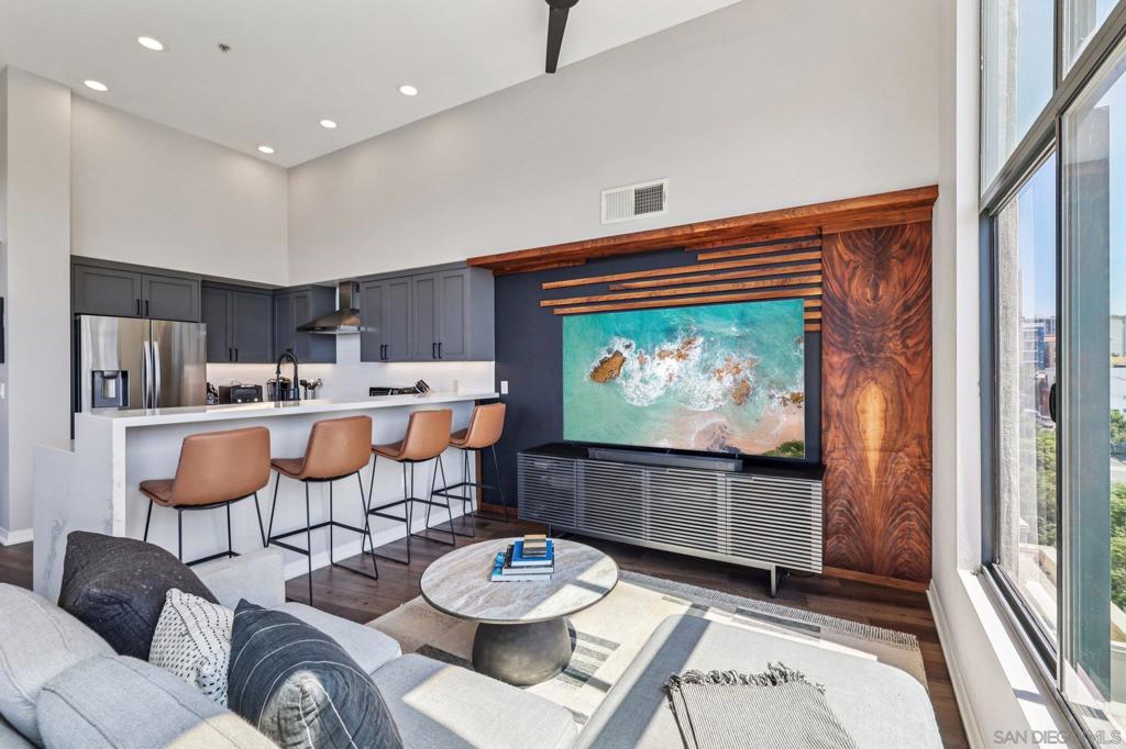 Experience breathtaking city and bay views from the top-floor, corner penthouse in DOMA—right in the heart of Little Italy. Rarely available and single-level, this 2 bedroom / 2.5 bathroom, 1,375 SF residence pairs dramatic high ceilings and an open, airy floor plan with wall-to-wall urban energy and sparkling water vistas from the living room and both bedrooms. A spacious private balcony —perfect for grilling and sunset watching— extends your living space outdoors. Two reserved, side-by-side parking spaces are conveniently located near the elevator for effortless city living. Inside, thoughtful upgrades elevate everyday life: luxury vinyl plank floors, new carpet, fresh paint, and a reimagined chef’s kitchen with quartz counters, new cabinetry, sink, and backsplash, plus a suite of newer smart appliances (cooktop and fridge). The living area features custom wood paneling by a local artist, while electric smart shades in the living room and bedroom dial in light and privacy with a tap. Both bathrooms showcase new tiling; the primary suite shines with a fully redone bath (new shower, dual sinks, lighting, cabinetry, and quartz backdrop) and a custom built-in closet. Ample cabinetry maximizes storage throughout and a spacious in-unit laundry room adds everyday convenience. Step outside your door to Little Italy’s restaurants, cafés, and weekend mercato—or head upstairs to DOMA’s rooftop deck for sunsets and the fitness room for on-site wellness. This is the one you’ve been waiting for!