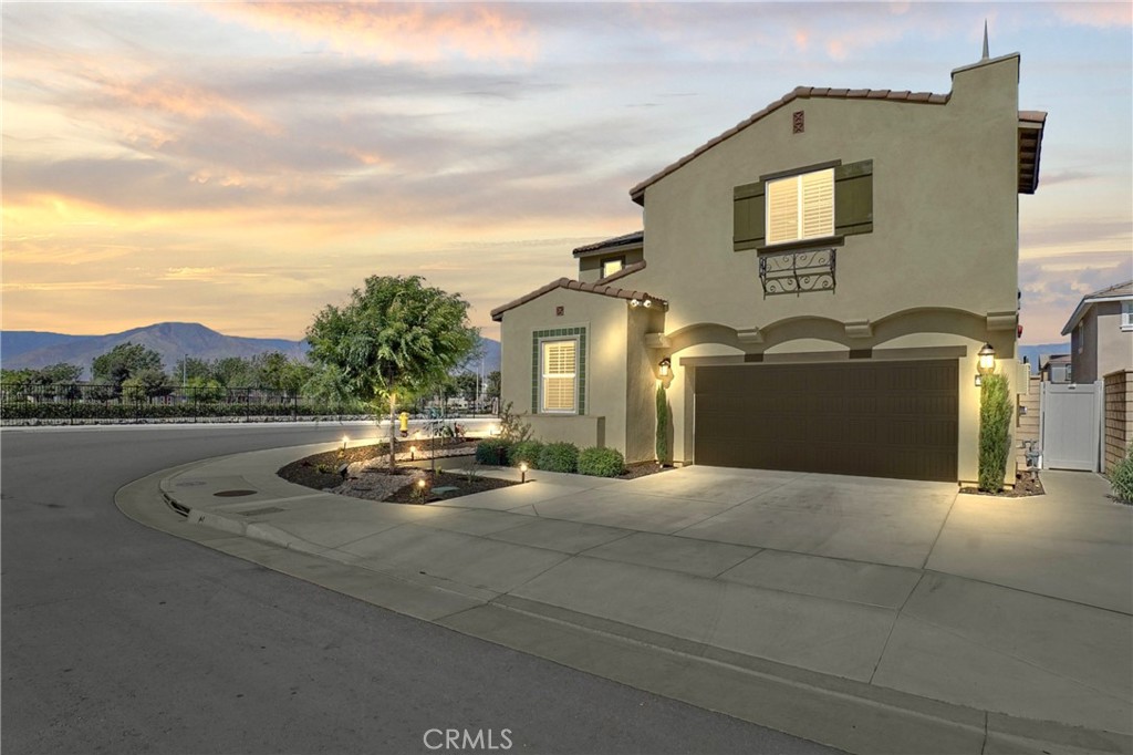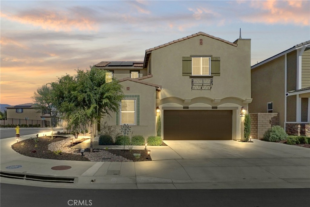PAID OFF SOLAR! Lower Mello Roos Tax For a 2022 Built! Welcome to this stunning newer 2022-built home nestled in the highly desirable Lennar Master Community at Traditions of Redlands. Experience modern living in this meticulously renovated home, perfectly situated on a quiet CORNER Prime Lot. With many high-end upgrades, this compound feels just like a Model Home. The extended custom driveway and walkway front entrance, along with a professionally landscaped front yard, enhance the home’s inviting, gorgeous curb appeal. As you step inside, you’re greeted by an open, airy layout anchored by a bright living room showcasing soaring high ceilings, recessed lighting, luxury flooring, and a sophisticated custom light fixture. Featuring 4 Bedrooms, including a versatile Main-Floor room ideal for guests or a private home office and 2.5 bathrooms, this home is perfect for growing families. The entire space is filled with natural light that beams through energy-efficient windows adorned with elegant plantation shutters. The living area flows effortlessly into a stylish dining space and a Modern Kitchen featuring stainless steel appliances, quartz countertops, an oversized Center Island, crisp white cabinetry, and a walk-in Pantry perfect for the avid home chef. A sliding glass door leads to an entertainer’s dream private backyard with top of the line Stamped Concrete flooring, built-in lighting along the retaining planter, and ample space to enjoy the California weather. Ascend the beautifully crafted staircase upstairs to find a spacious Loft, Two generous Bedrooms, a Full Bathroom with a tub, a Walk-in linen closet, and a Laundry room with extra storage cabinetry. The expansive Primary Suite Bedroom offers a luxurious escape, complete with a large walk-in shower, dual vanity sinks, and a generous walk-in closet, ensuring comfort and convenience every day. Park your vehicles inside the fully finished two-car garage with Epoxy Flooring and Hexagon ceiling lights. Modern energy-efficient technology features include Fully Paid OFF SOLAR panels, a tankless water heater, and a smart home security system. With Low HOA fees, access to a community park and playground, and a prime location close to shopping, freeways, and entertainment, this model-like home surrounded with serene scenery – truly has it all. This is a rare opportunity you won’t want to miss.