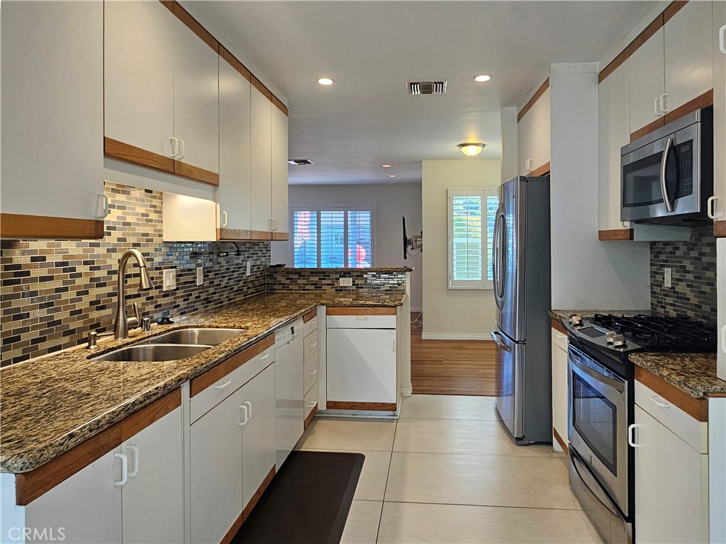 3 spacious bedrooms and 3 bathrooms in Popular Encino location, includes 2 bedrooms with en-suite baths, providing added Privacy and Comfort. Hardwood floors throughout, Central Air/Heat, Dual-Pane Windows with Plantation Shutters, and Recessed Lighting that creates a warm, inviting atmosphere. The Kitchen boasts granite countertops, with Breakfast/Buffet Bar and stainless steel appliances, perfect for preparing gourmet meals. A separate dining area provides the ideal space for entertaining guests or enjoying family meals. Outside, the low-maintenance patio with a BBQ area is perfect for outdoor gatherings and relaxation. The home also offers convenient front and rear driveways with a gated entrance, providing extra parking space for multiple vehicles or guests.