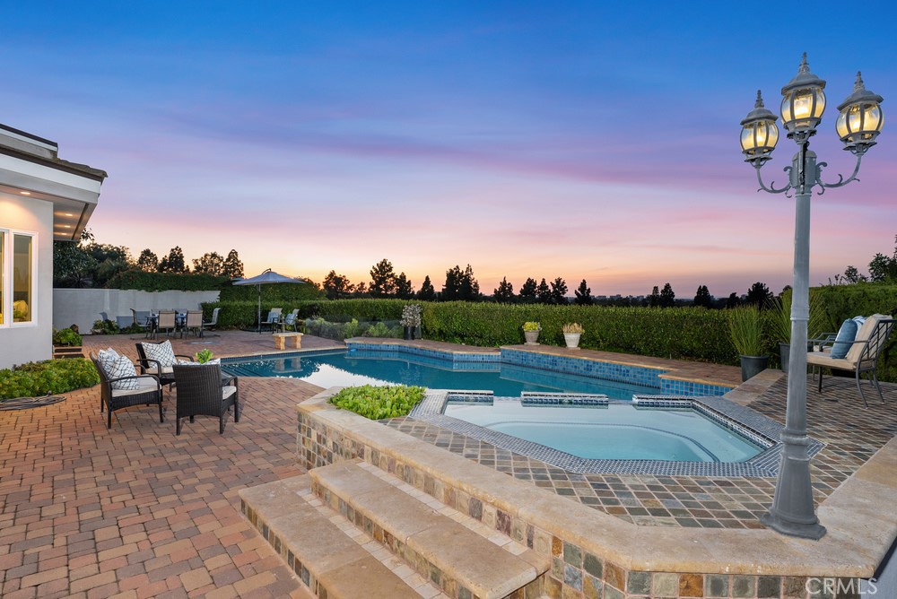 Welcome to an extraordinary custom single level modern masterpiece, perched in the coveted hills of Turtle Rock. This one-of-a-kind residence boasts gorgeous sunsets and unobstructed panoramic views, capturing the beauty of rolling hills and city lights, and even Disneyland fireworks. Radiating contemporary elegance, no detail has been overlooked in its impeccable craftsmanship designed for effortless easy-care and seamless indoor/outdoor living.This exceptionally private architectural gem was custom built in 2017, with nearly $800,000 invested at the time to elevate it to an unparalleled level of modern refinement. The moment you step inside, an awe-inspiring sense of openness greets you, as dramatic 16’ wide by 8’ high La Cantina doors dissolve the boundary between indoors and out. Additional strategically placed windows frame the stunning vistas, bathing the interiors in an abundance of natural light. At the heart of this home is an expansive great room, where soaring ceilings create an airy and inviting atmosphere. A luxurious family lounge features a sleek 75” Samsung TV, a striking contemporary fireplace, and a built-in entertaining bar complete with a wine refrigerator. The adjacent dining area is defined by a dazzling statement chandelier, setting the stage for unforgettable dinner parties against the backdrop of mesmerizing twilight views. The designer kitchen offers a stunning 14-foot-long waterfall-edge island is complemented by high-gloss white cabinetry and top-of-the-line KitchenAid appliances and sleek clean lines make this kitchen as beautiful as it is practical.The primary suite includes a private office/sitting area. The ensuite spa-inspired bathroom features floating vanities, designer lighting, and extensive use of Carrara marble-inspired finishes.A secondary en-suite bedroom continues the theme of refined modernity, with its own impeccable design and high-end finishes. Even the guest bath exudes elegance and a commitment to luxury. Revel in the resort-inspired backyard, where the expansive patio invite relaxation and entertainment alike and a sparkling pool and spa provide a serene oasis. Enjoy the seamless fusion of contemporary luxury with the great outdoors, state-of-the-art technology and awe-inspiring views. Award winning Turtle Rock Elementary & University High School are steps away. Exceptional nearby community facilities.