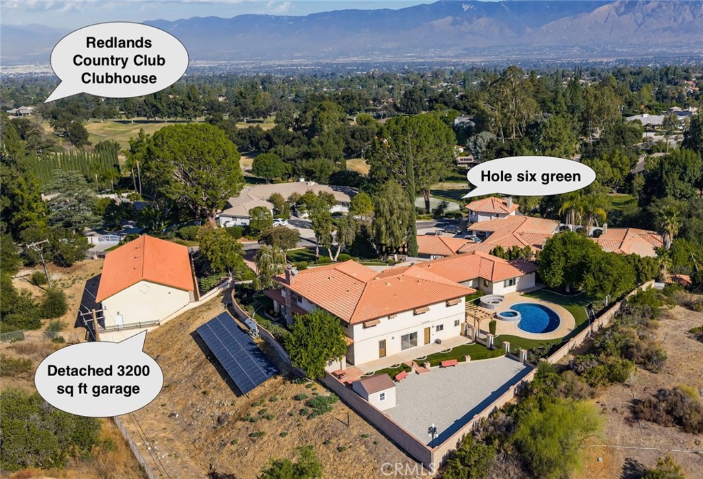 South Redlands five bedroom pool home with an attached seven car garage, detached 3200 square foot garage, and over 5500 square feet of living space on a nearly 50K square foot lot – just a chip away from the green at Redlands Country Club hole six! When you approach the home, you are greeted by a sizable circular driveway at the top of the private street that is Country Club Lane. You enter the home into the formal front foyer, which features the first staircase and vaulted ceilings. This well lit space displays stained glass pieces from local artist, Tom Medlicott. The entry is flanked by two living areas, a formal living room and a family room with an exposed beam ceiling; both of which feature large fireplaces. The family room, which has a direct access into the attached seven car garage (fully finished with tile flooring and a built in air compressor), opens up into the game room. That flows right into the center of the home, where you’ll find a full sized wet bar and a second set of stairs. This space at the center of the home opens up to the second story interior balcony. Opposite the game room is a formal dining area, with direct access into the kitchen. It’s generous layout features tremendous counter space, two dishwashers, a double oven, gas cooktop, wine fridge, prep sink, and plenty of storage. There is also an eat in dining area with a slider leading out into the back yard. Windows and doors throughout the home have been upgraded. Off of the kitchen, you’ll find a large laundry room with additional counter space, a separate sink, more cabinets, and a small built in office area. Heading outside, the pool and spa with a glass mosaic finish serve as the centerpiece of the yard, which also has a gas fire-pit and low maintenance landscaping features. Five bedrooms are upstairs, including the primary suite. A newly renovated bathroom features a sizable dual vanity with a make up counter, a soaking tub, walk in shower, and a separate toilet room. The other bathrooms have been recently upgraded as well with new counters, fixtures, flooring, and lighting. There is a private office space off of the primary bedroom. Heading back outside, the exterior garage space is as impressive as the home. One of the largest private garages in Redlands, this is perfect for your car collection, the ultimate home gym or workshop, multiple class A RVs, or all of the above. Excellent Redlands Schools.