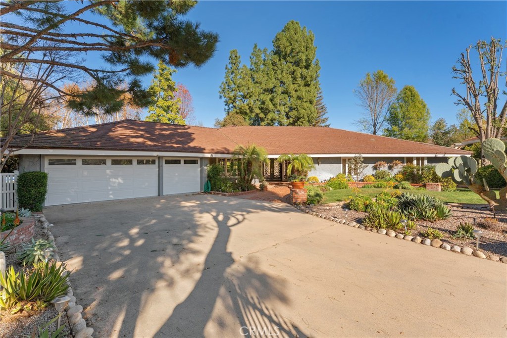 Sprawling single story approx. 4,000 SF gated estate located South of the Boulevard in desirable Vista De Oro at the very end of a quiet cul-de-sac on an almost 19,000 SF lot. The private property sits back from the street behind an automatic security gate & separate pedestrian access. Spacious front yard has rolling front lawn with drought resistant landscaping, mature trees, & long driveway that leads to the 3-car attached garage with built-in storage and direct access. A meandering brick pathway leads to the covered front porch with double door entry. Step inside to find a grand entry foyer with wood beamed tray ceiling, coat closet, & convenient guest powder bathroom. The formal living room has brick fireplace, wood product walls, crown moldings, & French doors that open to backyard. Separate family room features vaulted wood beamed tongue & groove ceiling, brick fireplace, built-in display & storage cabinetry, & French doors that open to the yard. Formal dining room has buffet counter with custom storage cabinetry, gorgeous parquet wood floors, and large picture windows overlooking the exterior. Chef’s upgraded kitchen features large center island, stainless appliances including Miele double ovens, Subzero refrigeration, Viking 6-burner stove + grill, two warming drawers, walk-in pantry, & separate breakfast room with built-in bench seating and expansive storage cabinetry & counter space. Grand primary suite boasts double door entry, French doors that open to the backyard, built-in storage, two oversized walk-in closets with custom built-ins, and luxurious en-suite upgraded bathroom with custom vanity, dual sinks, stone counters, separate makeup vanity, large walk-in shower with dual bench seats & raindrop shower head, & separate spa tub with jets. Attached to the primary is a massive bonus room providing ideal flex space for office/gym/5th bedroom featuring French doors that open to the yard, large walk-in closet, and built-in desks & storage. There are three additional secondary bedrooms, two share a large bathroom with walk-in shower and the third has its own bathroom with shower & tub. There is also a laundry room with storage and exterior access. The entertainer’s backyard boasts swimming pool with children’s safety gate, large covered pergola for outdoor dining, separate Saltillo tiled patio with BBQ center, and lush landscaping with grass lawns and fruit trees. Adjacent to Topanga Mall/Village, Warner Center, hiking trails & minutes to Malibu.