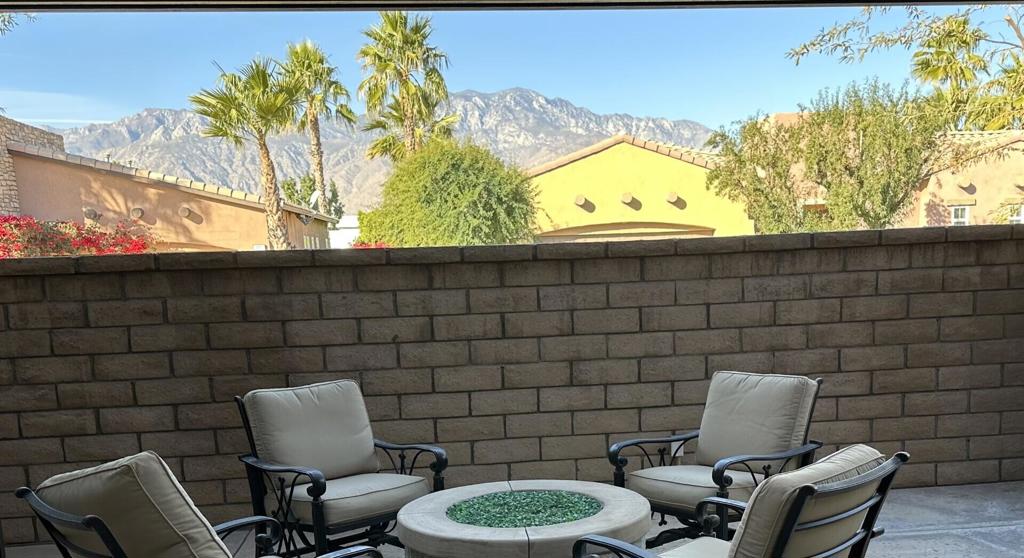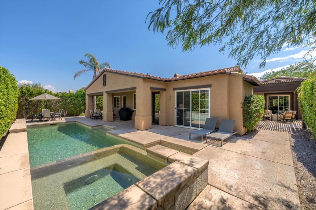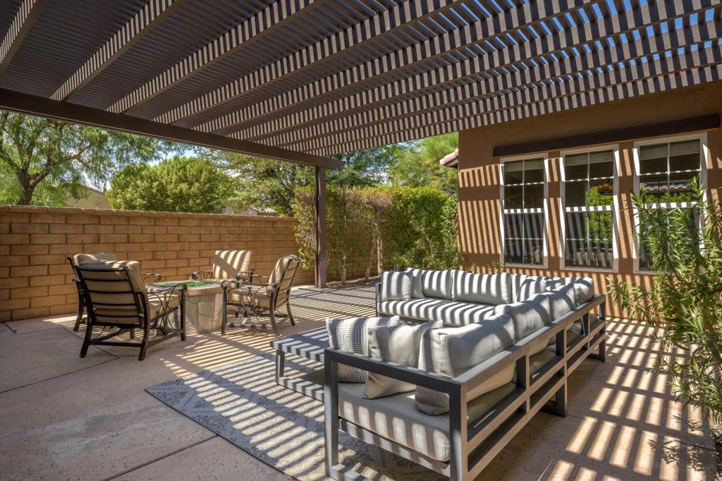 Discover this exquisite Santo Tomas home on a corner lot in a peaceful cul-de-sac. Enjoy total privacy with lush landscaping around your saltwater pool and spa, complete with elegant water features–perfect for desert days and nights. Inside, soaring ceilings and a smart layout offer great bedroom separation. The living and dining rooms feature a cozy fireplace, and the family room connects seamlessly to the kitchen. The home centers around an inviting courtyard with a fire feature and a spacious patio cover for entertaining. Freshly painted interiors, a recently painted exterior, and new front landscaping add to the home’s charm. The kitchen boasts sleek black appliances and granite countertops, while the primary suite offers a walk-in shower, soaking tub, and dual vanities. 38 leased Solar panels enhance energy efficiency. Santo Tomas is a highly sought-after community with a serene lake, perfect for sunset cruises. The low HOA fee includes social and tennis memberships to the Mission Hills Country Club and include pickle ball, fitness/gym, and dining, which makes for an incredible value! Sold furnished per inventory list, this home is move-in ready! 38 Solar Panels. Lease is $294.73 per month.