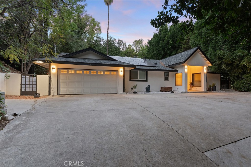 Extremely private single story gated estate located on a sprawling 20,000 SF lot South of the Blvd in the highly desirable neighborhood of Vista De Oro. The property sits far back from the street behind an automatic security gate and mature privacy hedging. An oversized driveway can accommodate parking for large gatherings and leads to the attached 2-car garage with 2 EV chargers. The grand double door entry foyer opens to a light and bright completely open floor plan with direct sight of the backyard setting an immediate tone for indoor/outdoor entertaining. The spacious family room has a plaster finished fireplace, tray ceiling, sliding glass doors that open to the yard, and wide plank hardwood floors found throughout. The equally large dining room also features a decorative tray ceiling and another glass slider that opens to the yard. The completely remodeled expansive kitchen opens directly to the living spaces and boasts center island with breakfast bar seating, Carrera marble counters & backsplash, custom soft close cabinetry, stainless appliances including a Miele range, and separate walk-in pantry. There are three well appointed bedrooms each with their own en-suite bathrooms. The primary bedroom features double door entry, glass slider that opens to the yard, large walk-in closet, and private luxurious remodeled bathroom with dual sinks, spa tub, and walk-in shower. The second bedroom suite has closet with custom built-ins and private remodeled bathroom with tub and shower. The third bedroom is located off the entry making it the ideal office or guest suite with access to a remodeled bathroom with dual sinks and walk-in shower, perfect for powder bathroom use as well. The garage is completely finished with laundry area and large attic, providing perfect flex space for play room/gym/etc but still is a fully operational garage. The stunning backyard features pebble finished saltwater swimming pool and resort style spa grotto with cascading waterfall, smart covered patio with misters, BBQ center with sink, gas fire pit, huge grass lawn for play, and gorgeous canopy trees providing ultimate privacy from neighbors. Additional upgrades include completely owned solar panels, two Tesla power walls, “Brilliant” smart home lighting, and “Span” smart home electrical panel. Sale also comes with plans/estimates for ADU & JR ADU. Adjacent to Westfield Topanga Mall/Village, Warner Center, hiking trails and easy access to the beach and freeways.