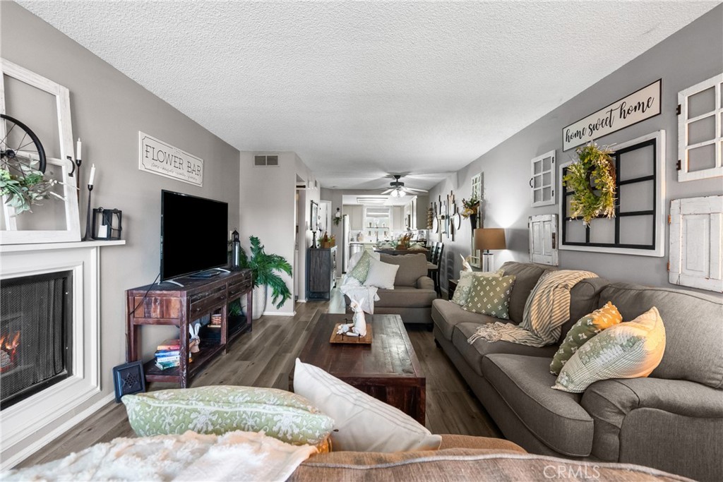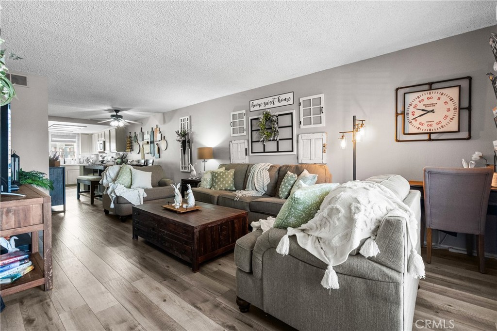 This inviting 2-bedroom, 2-bath condo offers comfort, style, and a wonderful community setting. Inside, you’ll find laminate wood flooring in the main living areas and tile flooring in the bathrooms, creating a warm and cohesive feel throughout. Plantation shutters add timeless charm and privacy, while upgraded lighting enhances the bright, airy spaces. The kitchen has been beautifully upgraded with quartz countertops, a porcelain tile backsplash, stainless steel appliances, and modern finishes, making it both functional and stylish. The washer, dryer, and refrigerator are included for added convenience. An indoor laundry area adds ease to everyday living. Both bathrooms have been upgraded with contemporary finishes, including a dual vanity in the primary bathroom that offers plenty of space and comfort. The well-designed layout provides a natural flow between the living, dining, and kitchen areas, ideal for relaxing or entertaining. Additional features include a 2-car garage and access to exceptional community amenities, including walking trails, three pools, tennis courts, gazebos, and a beautifully maintained greenbelt that creates a peaceful, park-like atmosphere. Conveniently located close to shopping, dining, and everyday essentials, with easy access to commuter freeways, this home offers the perfect blend of comfort, convenience, and lifestyle. A wonderful opportunity to enjoy low-maintenance living in a welcoming community—this is one you won’t want to miss.