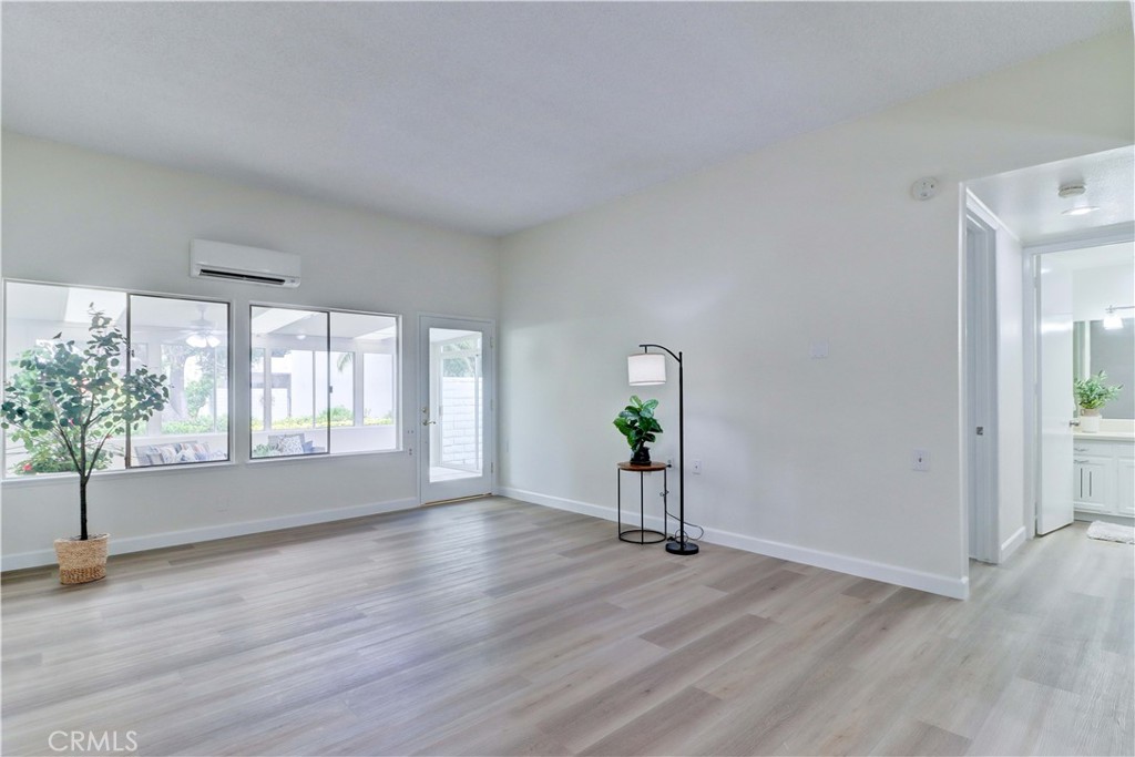 Upgraded “Coronado” co-op located in a beautiful area with sunny greenbelt location! Great improvements include enclosed front patio adding over 200 sq ft of living space (not included in sq footage total), brand new vinyl plank floors, fresh paint, ductless central mini-split system and partially open kitchen. Lovely setting close to carport and laundry room. Walk right up and notice the large patio storage cabinet and bright, enclosed sunroom with tile floors and light panels in the ceiling. Inviting glass front door leads to the living/dining area featuring 10 foot ceilings. There are 2 ductless mini-splits – one in living room and another in bedroom providing high efficiency heating and cooling. Kitchen area has been opened to provide easy interaction with the living room, cabinets refaced, brand new granite kitchen counters and microwave. Solartubes brighten the kitchen and bathroom areas. Bedroom and bathroom feature 7 foot doors to complement the high ceilings. There is a second mini-split in the bedroom to keep comfortable at night and large bathroom contains tub/shower combo. Laguna Woods Village residents enjoy a 27-hole championship golf course, a 9-hole executive par 3 course, pickleball and tennis courts, lawn bowling, gyms, clubhouses, swimming pools, horse stables, gardening centers, artist studios, computer workrooms and classes + over 200 clubs and organizations.