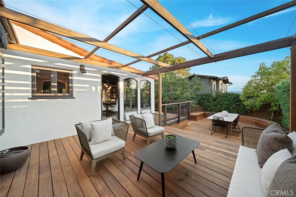 This single-level North Laguna residence in the Tree Streets embodies timeless California coastal living with a rare blend of privacy, craftsmanship, and character. Resting on a secluded corner lot along the prestigious High Drive, the home is framed by lush hedges, mature trees, and curated gardens, setting a serene tone from the moment you arrive. Behind the original front door, interiors reveal a meticulous attention to detail. Sunlight pours through an abundance of windows, highlighting refinished hardwood floors, custom Venetian plaster walls, hand-selected Alder wood doors, and exposed wood beams that echo the home’s architectural roots, originally built in 1937. Crown molding and crystal-accented Framburg lighting add a touch of classic elegance, while thoughtful updates ensure a seamless balance of historic charm and modern convenience. The kitchen is both functional and refined, anchored by a generous island, Wolf range, subway tile backsplash, and double pantry. A custom bar area discreetly integrates a home theater system and Sonos multi-room audio, creating a space as ideal for entertaining as it is for everyday living. The primary suite offers tranquil views of mature landscaping and remodeled bath with a spacious walk-in shower and soaking tub. A secondary bedroom overlooks the deck through a striking bay window. Third bedroom overlooks front yard. Outdoors, an IPE wood deck captures ocean views, while a covered patio invites year-round gatherings. Beneath the home, additional bonus space presents potential for expansion. Situated moments from Laguna Beach’s vibrant downtown, boutique shops, acclaimed restaurants, and world-renowned beaches in one of Laguna’s most coveted settings.