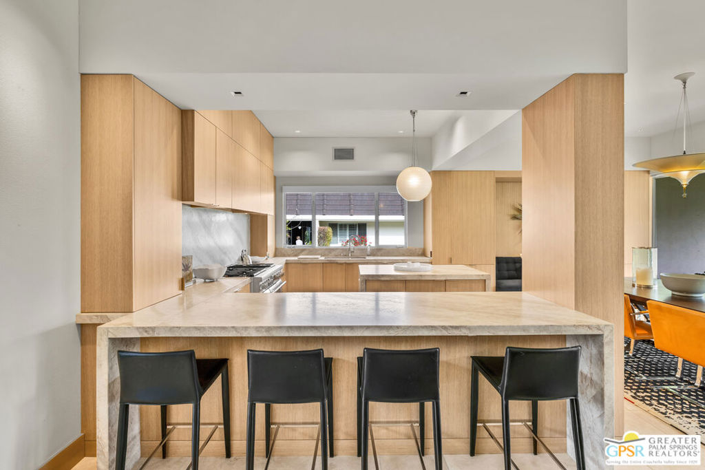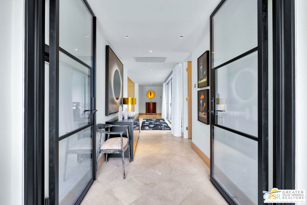 This exceptional residence is located in Marabella Estates in South Palm Springs. Built in 1971, the home exemplifies the mastery of Hollywood Regency style that meets Mid-Century Modern design. Spanning over 2,400 square feet, the home features three spacious bedrooms and dramatic floor-to-ceiling glass walls that open to expansive patios and private courtyard spaces. Thermal-pane anodized windows and sliding doors enhance comfort while framing stunning mountain views. The private courtyard connects two bedrooms and the main living area, creating an ideal setting for entertaining or enjoying a quiet morning coffee. The primary bath is a luxurious retreat, featuring a fully clad Calcutta Umber marble toilet and shower room. The vanity area includes electric heated floors, Calcutta Umber marble flooring, slab countertops with custom stone sinks, and custom bleached oak vanities and soffits. The closet and storage feature matching melamine shelving. Fixtures include Newport Brass hardware, a Kohler toilet with Toto bidet seat, Visual Comfort decorative lighting, and a Euro-style glass shower enclosure. Guest baths are equally refined, with fully clad Crema Vaccione limestone toilet and shower rooms. The vanity areas feature electric heated limestone floors, quartz countertops with custom quartz sinks, custom bleached oak vanities and soffits, matching melamine closets, Newport Brass hardware, Kohler toilets with Toto bidet seats, Visual Comfort lighting, and Euro-style glass shower enclosures. The home has been fully updated with new electrical and plumbing throughout. The reconfigured kitchen opens seamlessly to the great room and showcases custom bleached white oak cabinetry. Top-of-the-line Thermador appliances include a refrigerator/freezer combination, two dishwashers, microwave, refrigerator drawers, and a professional range with a 48-inch gas cooktop featuring six burners and a griddle. The range includes a large oven, a steam/convection/standard oven, and a warming drawer. All countertops and backsplashes are crafted from Taj Mahal quartzite. There are two washing machines and dryers in the indoor laundry room. This spectacular home is being sold with all furnishings, artwork and accessories. Additional upgrades include two HVAC systems installed in 2021, a urethane foam roof with a 10-year warranty installed in 2022, and a new garage roof replaced in 2025. Please see complete list of upgrades in the doc section.