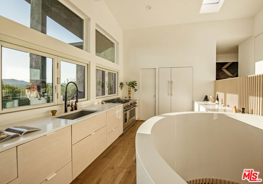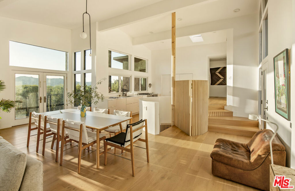 Cereza is an architecturally distinctive Topanga retreat and a true creative sanctuary. Blending rustic nature and design minimalism, the home is filled with shifting natural light from morning through dusk, creating a warm, organic atmosphere throughout. Offering breathtaking, unobstructed views, this pristine 4-bedroom, 3-bath residence is a rare opportunity to live on the coveted ridgeline that merges Topanga’s creative spirit with the modern luxury of Calabasas. A sculptural staircase anchors the home, serving as a striking architectural moment that defines the space. The upper level features a chef’s kitchen with outdoor counter seating that opens seamlessly to an airy living room and dual panoramic balconies. A private one-bedroom suite on this level includes a retro fireplace and sweeping views that make sunrise and sunset their own unique ritual. Downstairs, a second suite and two additional bedrooms connect directly to an expansive deck surrounded by lush landscaping and a tranquil Japanese soaking tub. Multiple outdoor lounge areas are positioned to take full advantage of the canyon setting ideal for entertaining, reflecting, or simply being present in nature. A detached cabin studio provides additional privacy and flexibility, complete with a built-in work area and loft bed for a guest. A dedicated yoga platform and suspension net allow you to float amongst the oaks, creating calm and connection with nature. Completing the property, a two-car garage currently serving as a ceramic studio and Hi-Fi movie lounge with adjoining gym adds versatility to this thoughtfully designed residence. Where design, nature, and intention converge. Welcome to Cereza.