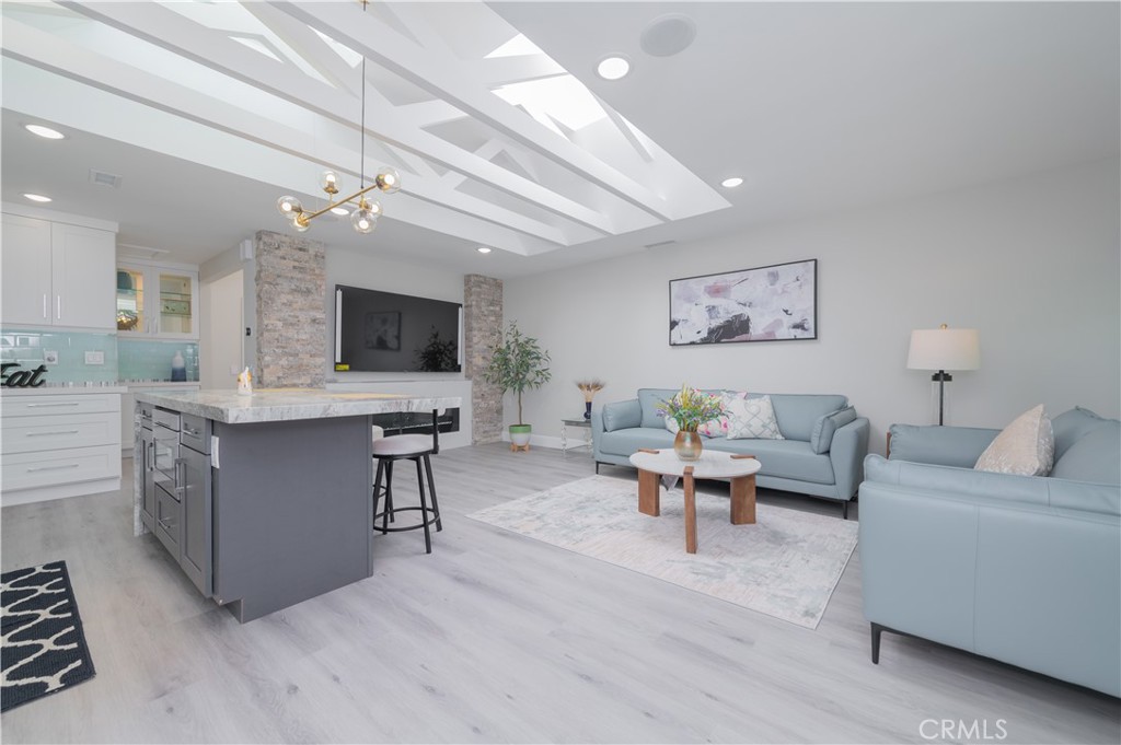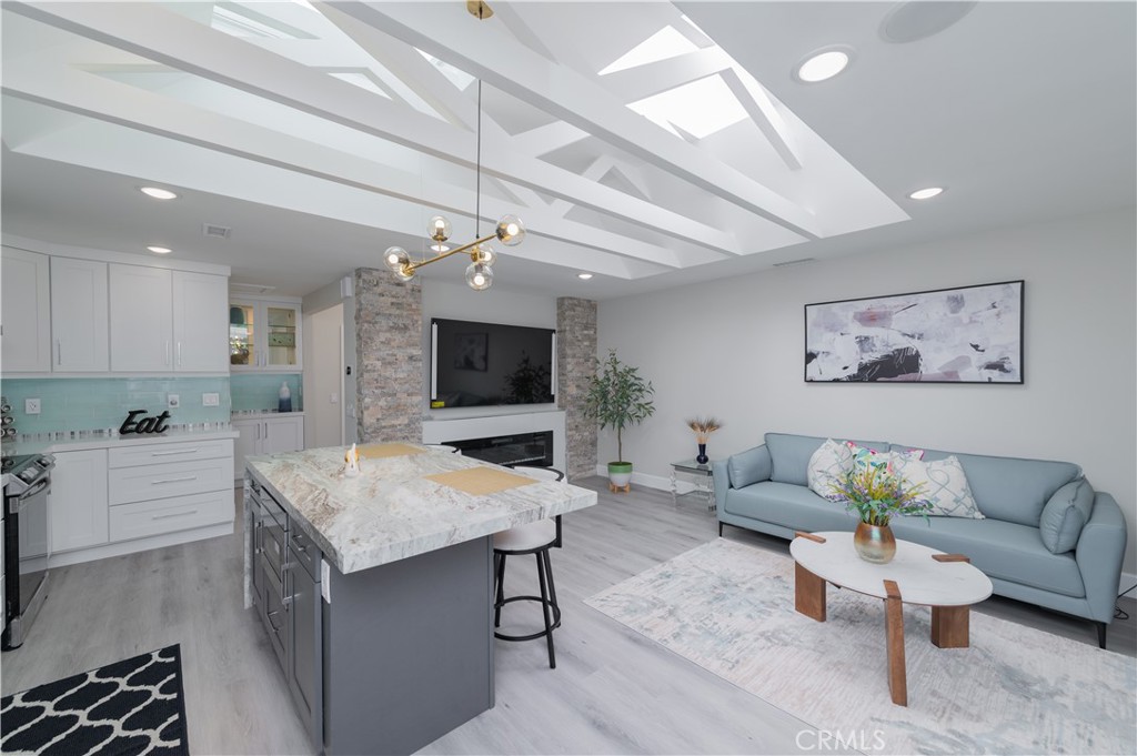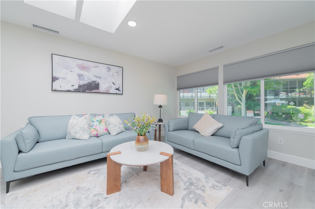 A one-of-a kind, custom-designed masterpiece, this home has been completely reimagined by a renowned architectural design team designed to meet the demands of modern living. This beautiful single story home is located in the desirable 55+ senior community of Laguna Woods Village. The home is flooded in natural light from multiple remote-controlled skylights throughout. Features include: A living room with stunning LED Fireplace beneath the TV and a Sound console system with Ceiling Speakers in every room. Elegant open floor plan gourmet kitchen with a Island matching light green Backsplash, high-quality cabinets, and top-of-the line stainless steel Appliances. Both the Master and Guest Rooms suit feature walk-in Closets. A Dining Room with a lovely setting, plus an additional Office Room with modern furnishings and light fixtures and A Half Bath for your Guest. New Waterproof Flooring throughout. New Washer and Dryer. New Central AC and Heating System, Double-Pane Windows. New Entrance Gate and Front Doors. This is a special Designer Home. You must come and see this magnificent home!