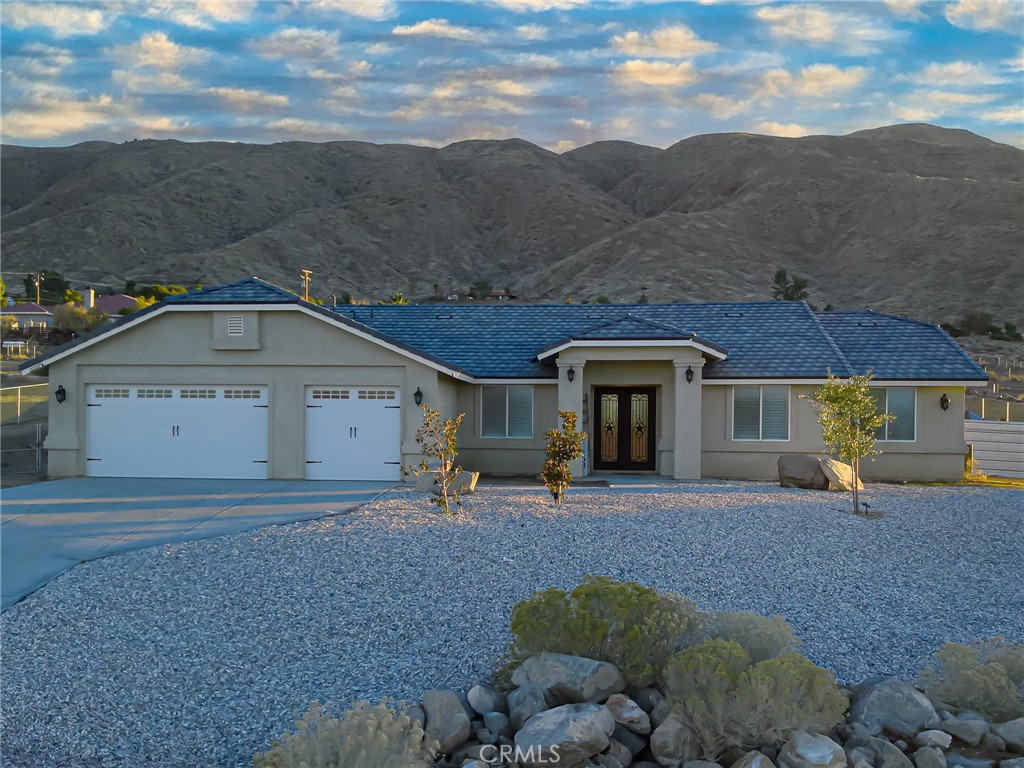 Welcome home to the perfect blend of luxury and wide-open country living in Apple Valley. This 2021-built beauty sits on over an acre of usable land and captures the heart of the desert with spectacular sunrises and sunsets, mountain backdrops, and room for horses and farm animals. Spend your days relaxing in the custom saltwater pool and spa, hosting gatherings on the spacious deck, or enjoying quiet moments in your beautifully designed outdoor spaces. The front yard offers low-maintenance beauty with custom rock landscaping, trees, and elegant night lighting. Inside, every detail shines – 4 spacious bedrooms, 2.5 impeccable appointed baths, and 2089 sq. ft. of living space. This home boasts plush bedroom carpeting, premium waterproof wood-look flooring, designer lighting, lovely shutters throughout and a custom front door that elevates curb appeal. The gourmet country kitchen shines with quartz countertops, black stainless steel appliances, a large island, and custom cabinetry with abundant storage. Retreat to the luxurious master suite with a soaking tub, walk-in shower, dual sinks, and stylish black finishes. The oversized 3-car garage with ample lighting, concrete pathways connecting the garage and outdoor spaces rounds out this exceptional property. A TRUE ENTERTAINERS DELIGHT—YOUR DESERT DREAM AWAITS!